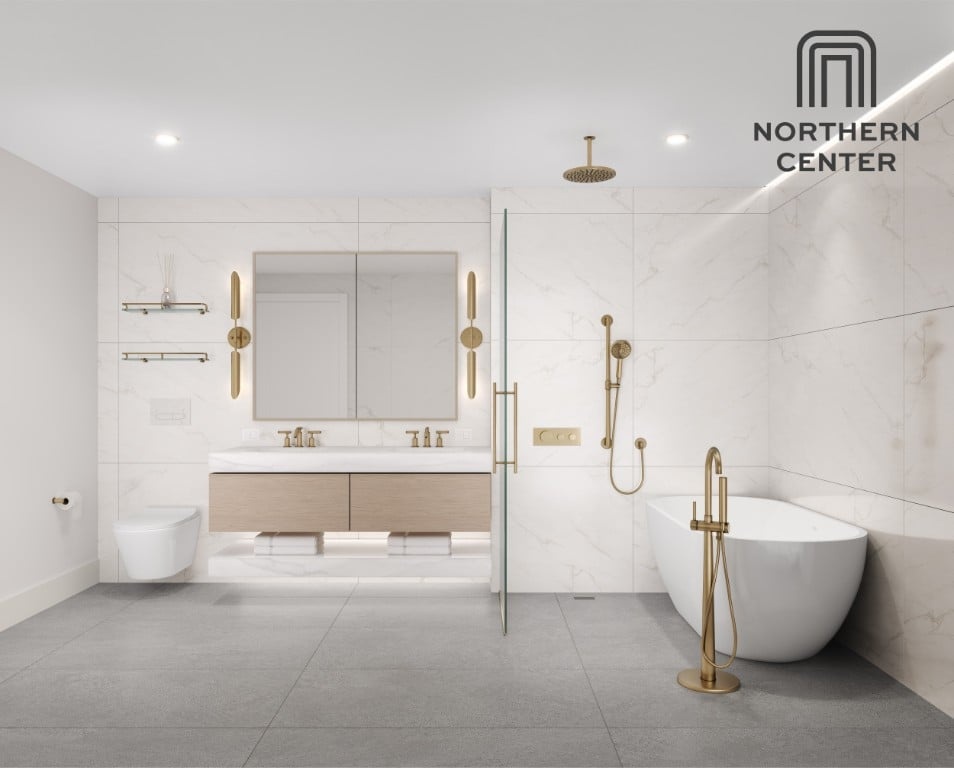 Northern Center offers more than 130 meticulously designed residences ranging from studio, one to three bedrooms. Upon entering, the 9'-5"+ ceiling heights and expansive windows fill the rooms with natural light, creating a spacious environment. Deep balconies provide spectacular panoramic views of the New York City skyline. Inside the residences there is a harmonious blend of refinement and functionality. Five-inch white oak floors add timeless sophistication and a warm ambiance to the living spaces. The kitchens feature sleek and modern design with ample quartz-stone countertops and backsplashes. Premium Bosch appliances seamlessly integrate into oak veneer cabinets.