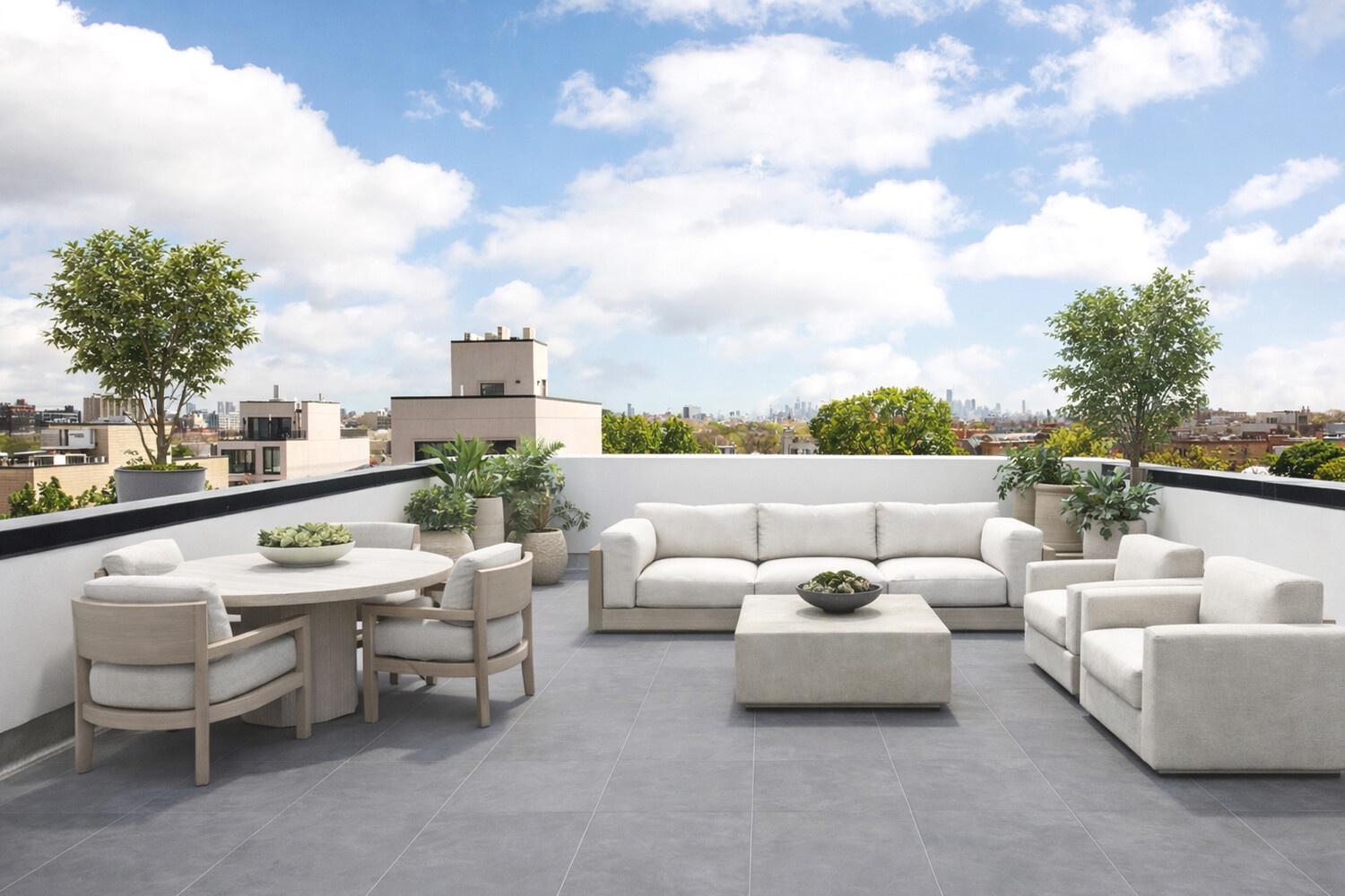 The primary bedroom accommodates a queen-size bed and offers a generous closet, allowing for a calm and well-proportioned retreat. On the upper floor, the home's defining feature unfolds: a second bedroom opening directly onto two private rooftop terraces with sweeping 360-degree views. Spanning 808 square feet, this expansive outdoor extensions are perfectly suited for effortless entertaining, sun-filled afternoons, or quiet moments above the rhythm of the city.