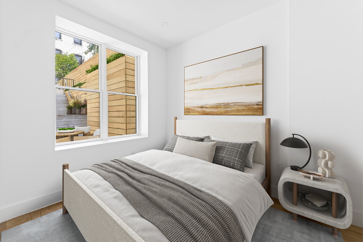 The garden apartment is a well-appointed one-bedroom, one-bathroom apartment with 569 interior square feet, with high ceilings and large windows that bring in light and create an open, airy feel. A spacious living room opens onto a stunning 962-square-foot private garden. Crafted for both entertaining and everyday living, this expansive sunny retreat offers endless possibilities for relaxing and lounging.