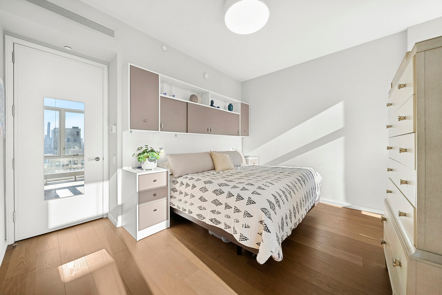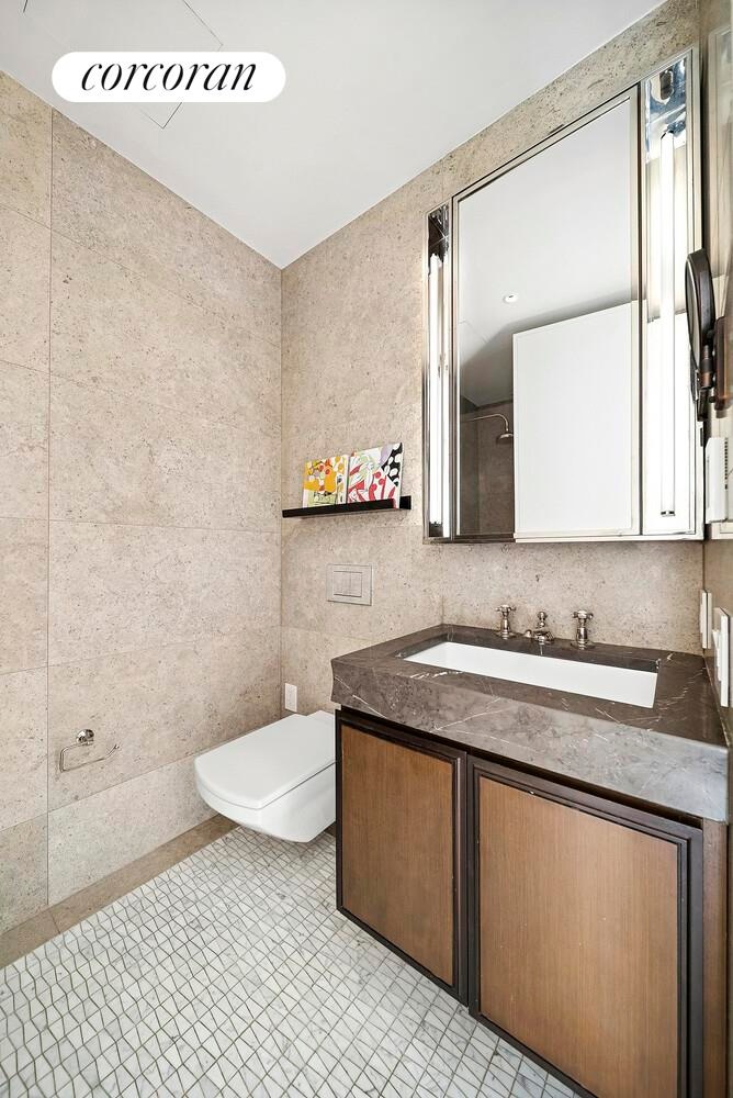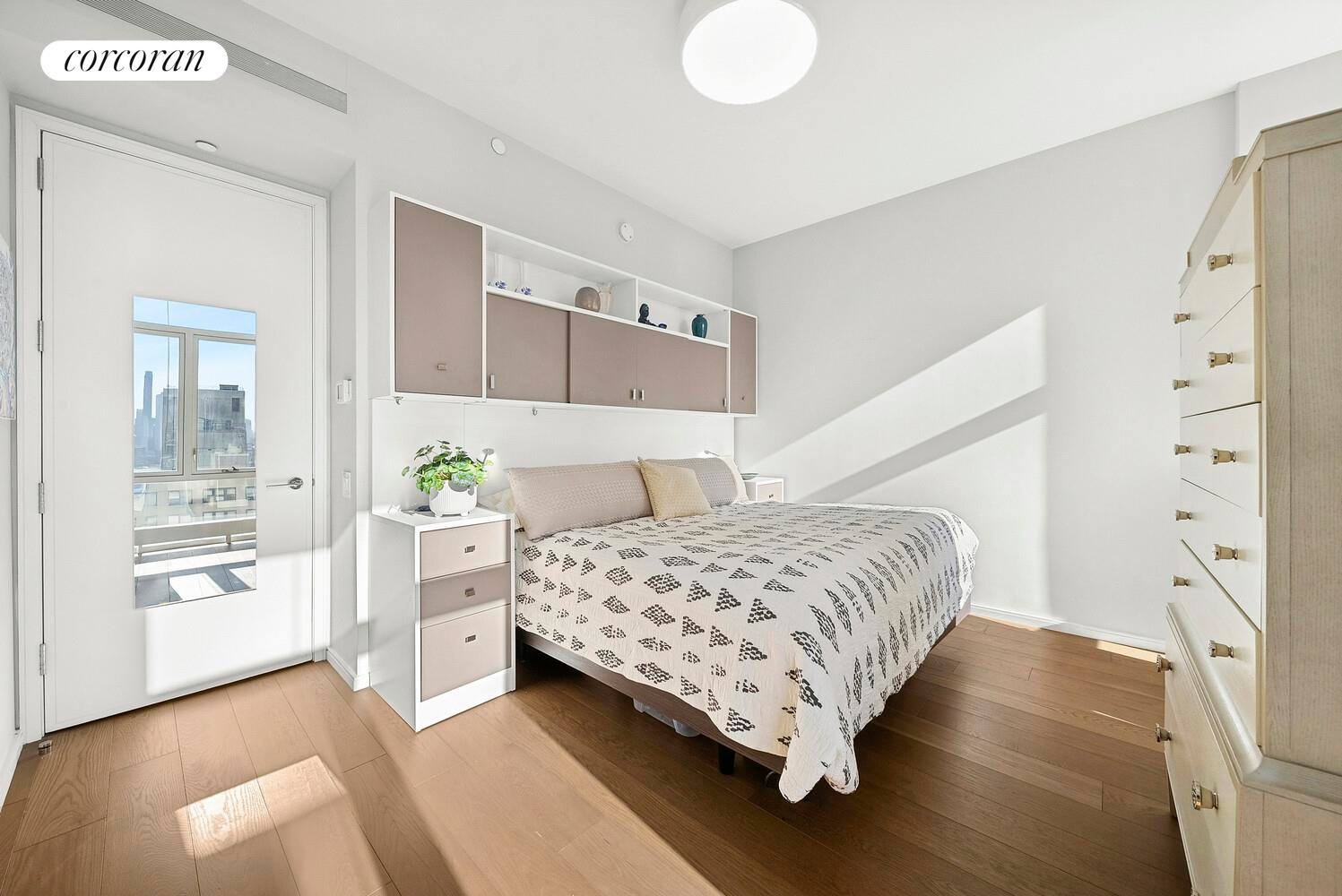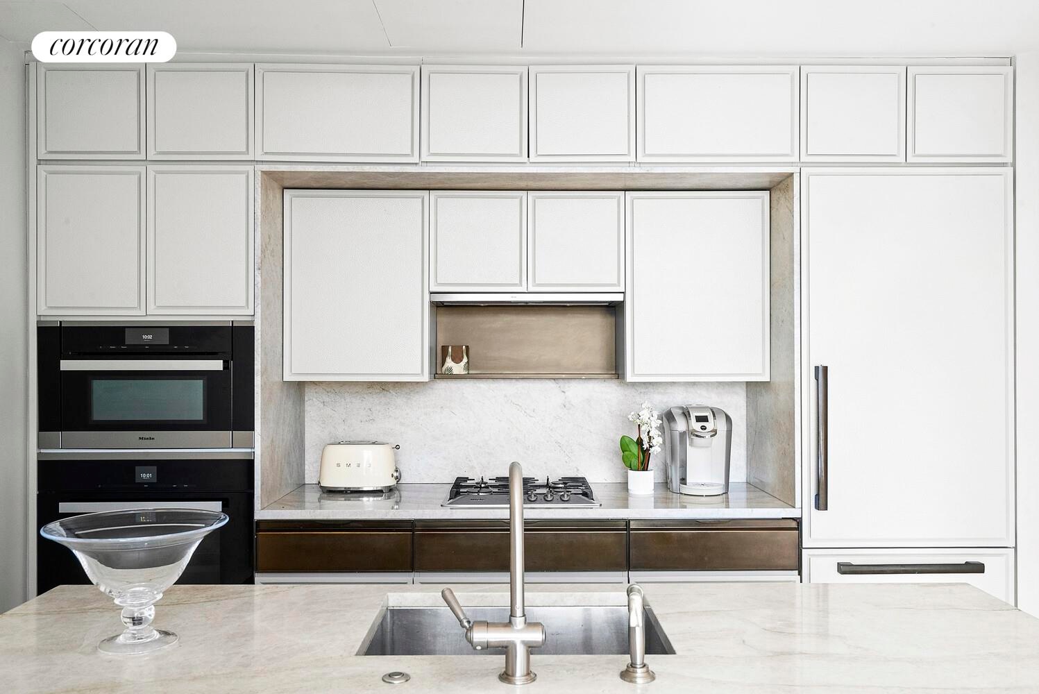 A gorgeous mahogany entry door and 7" plank oak flooring leads to an open living and dining concept which features a center island chef's kitchen with sleek Madreperola Quartzite Stone countertops and backsplash, custom designed textured metal cabinetry complemented by antiqued brass finishes, recessed under-cabinet LED task lighting, Waterworks fixtures and Miele appliances. In addition to under-the-counter wine storage, the integrated suite of Miele appliances includes a wall oven, speed oven and refrigerator/freezer. Adjacent to the foyer, a large bedroom with custom built-in cabinetry and room for a king-sized bed with two nightstands, dresser, and sitting area, ample closet space designed California Closets and 10' floor-to-ceiling windows. The sophisticated Honed Limestone/marble bathroom is out fitted with a custom designed vanity, medicine cabinet and lighting finished with Waterworks fixtures and Gioia Venatino Bow-Tie mosaic marble radiant heated flooring. A Miele washer and dryer, customized built-in closets, pantry and motorized shades in the bedroom and living room as well as designer lighting by Serge Mouille and Flos Lighting complete this stunning residence.