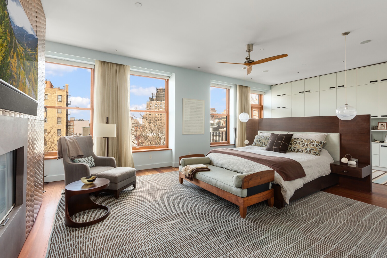 A breathtaking 40' 25' Great Room anchors the home, defined by five oversized windows, including three dramatic arched windows that create a uniquely striking architectural aesthetic. The living and dining areas benefit from double-corner exposure with North, South, East, and West light, bathing the space in natural sunlight throughout the day and offering sweeping Village and skyline views.