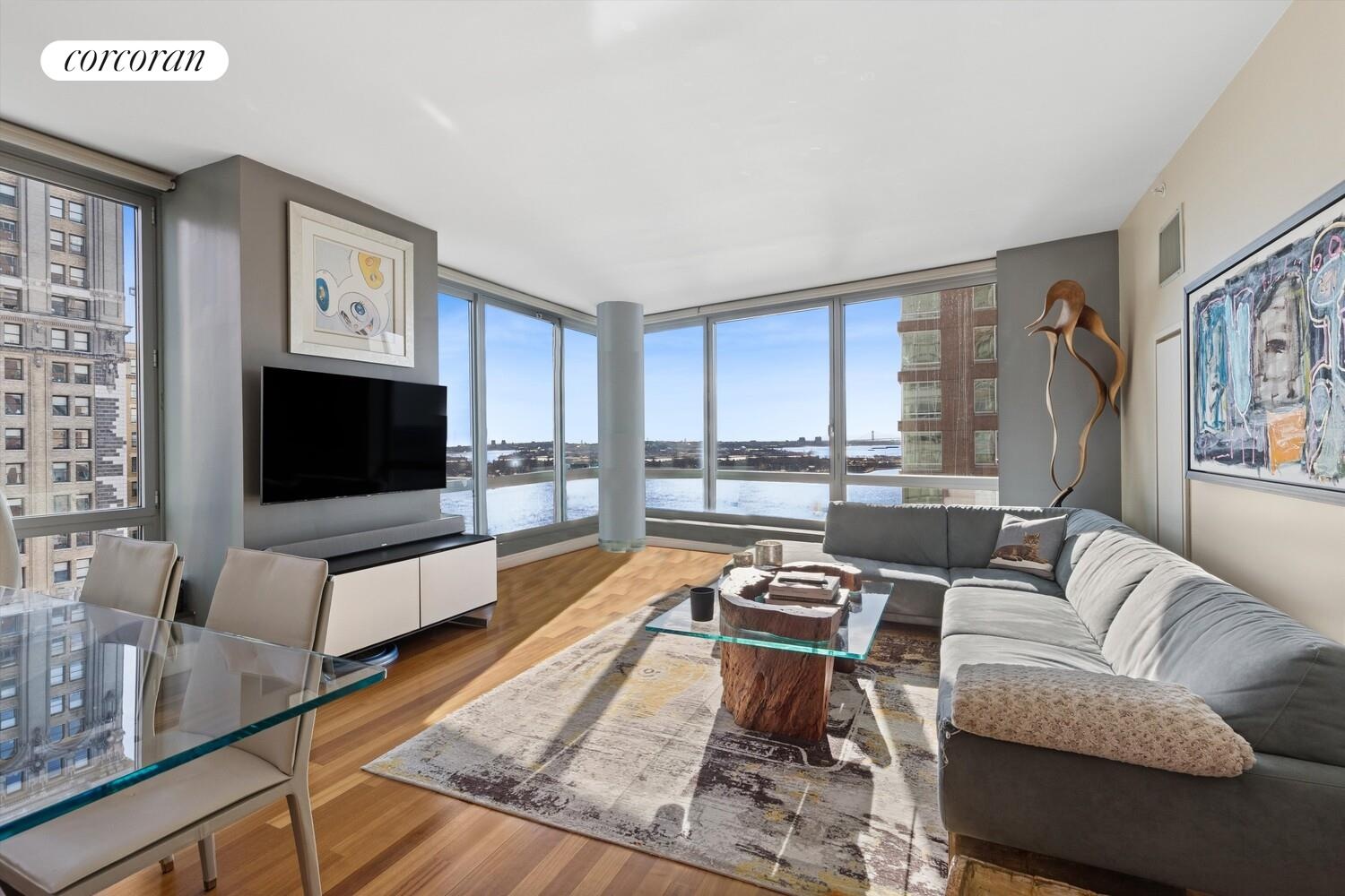 First time on the market! Welcome to Apt 26E - the largest and most coveted southeast corner two-bedroom line at Millennium Tower Residences in Battery Park City. With floor-to-ceiling windows and open sky exposure, this home is flooded with natural light all day and frames breathtaking panoramas of New York Harbor, Governor's Island, Battery Park, and the Statue of Liberty.
