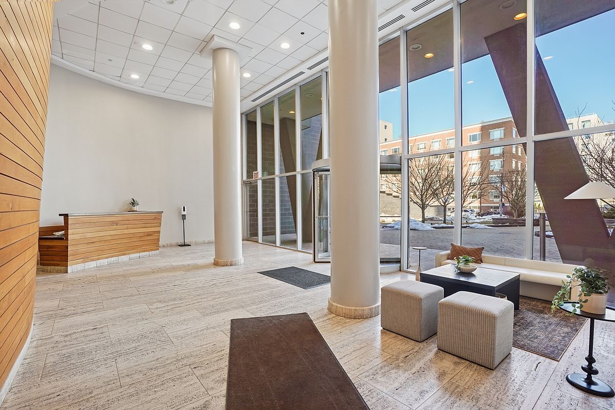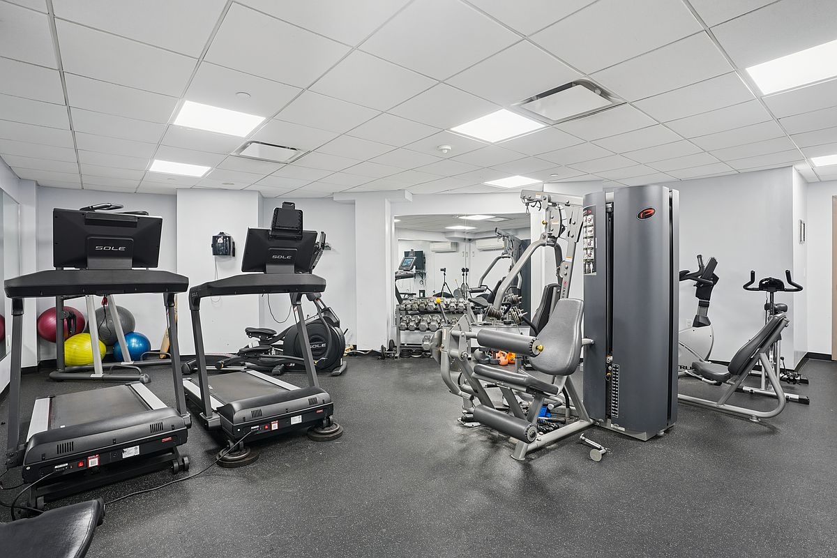 East River Tower is a full-service condominium offering a 24-hour doorman, modern lobby, fitness center, landscaped courtyard with grilling area, elevator access, garage parking, and professional management.