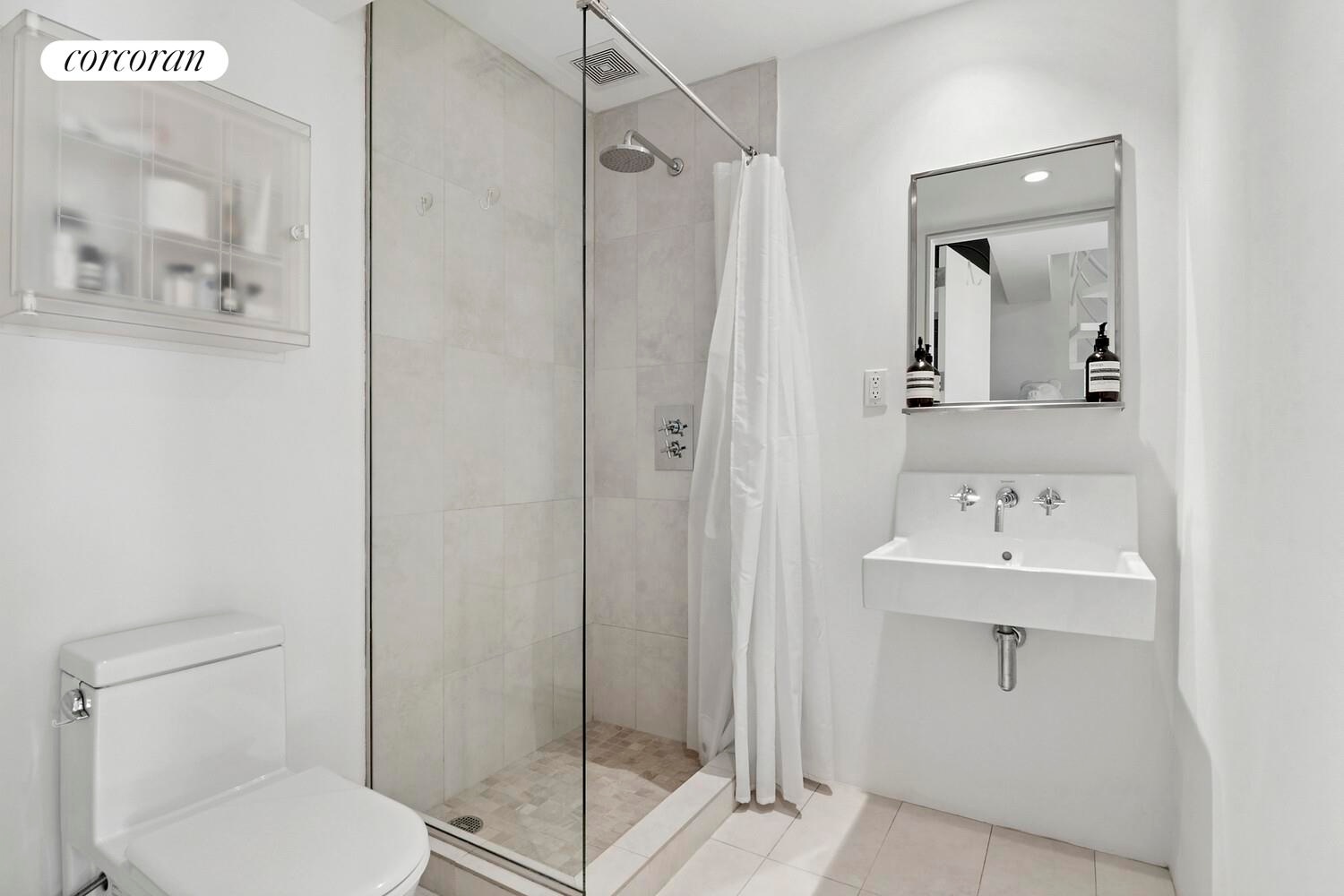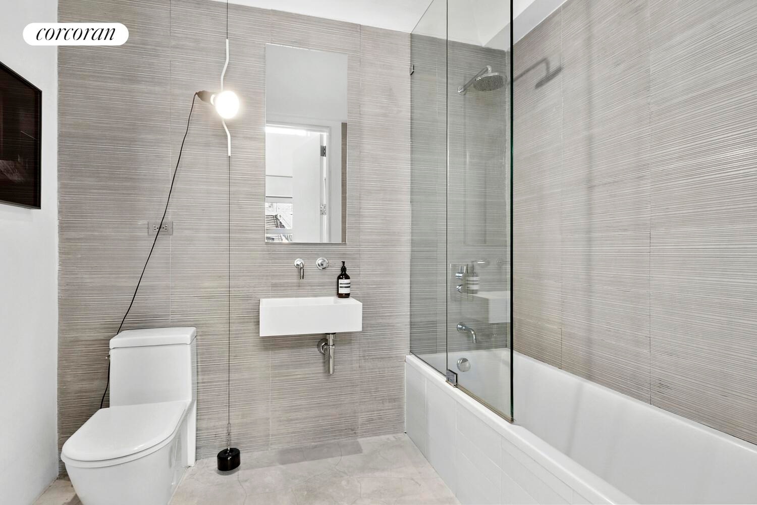 The primary suite is a refined retreat, complete with a custom oversized closet and a spa-inspired en-suite bathroom. Indulge in the Stark and Duravit soaking tub, paired with elegant Hansgrohe fixtures, evoking an industrial-chic aesthetic with a touch of luxury.