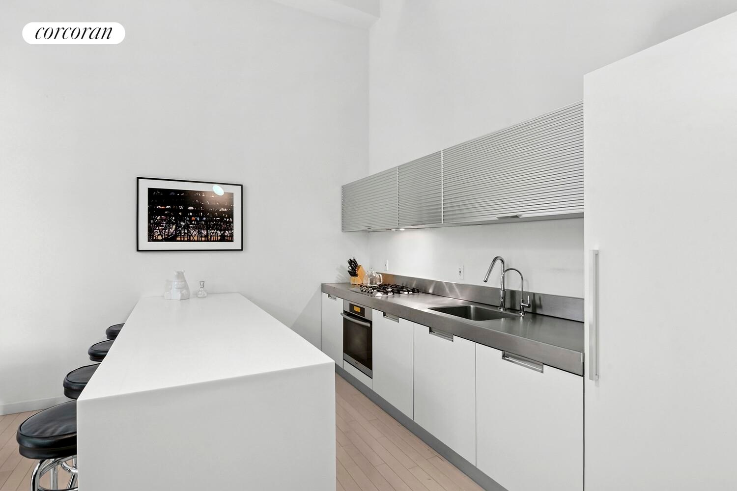Step into an open-concept loft, where a voluminous, soaring living and dining space, beautifully framed by floor-to-ceiling south-facing windows, invite sun-soaked south facing light. The chef's kitchen is a masterpiece, featuring premium Miele and Liebherr appliances, sleek stainless steel countertops, and a sophisticated Corian-style island, perfect for stylish entertainment. Embraced by the privacy of a south facing, spacious balcony surrounded by lush foliage of mature trees.