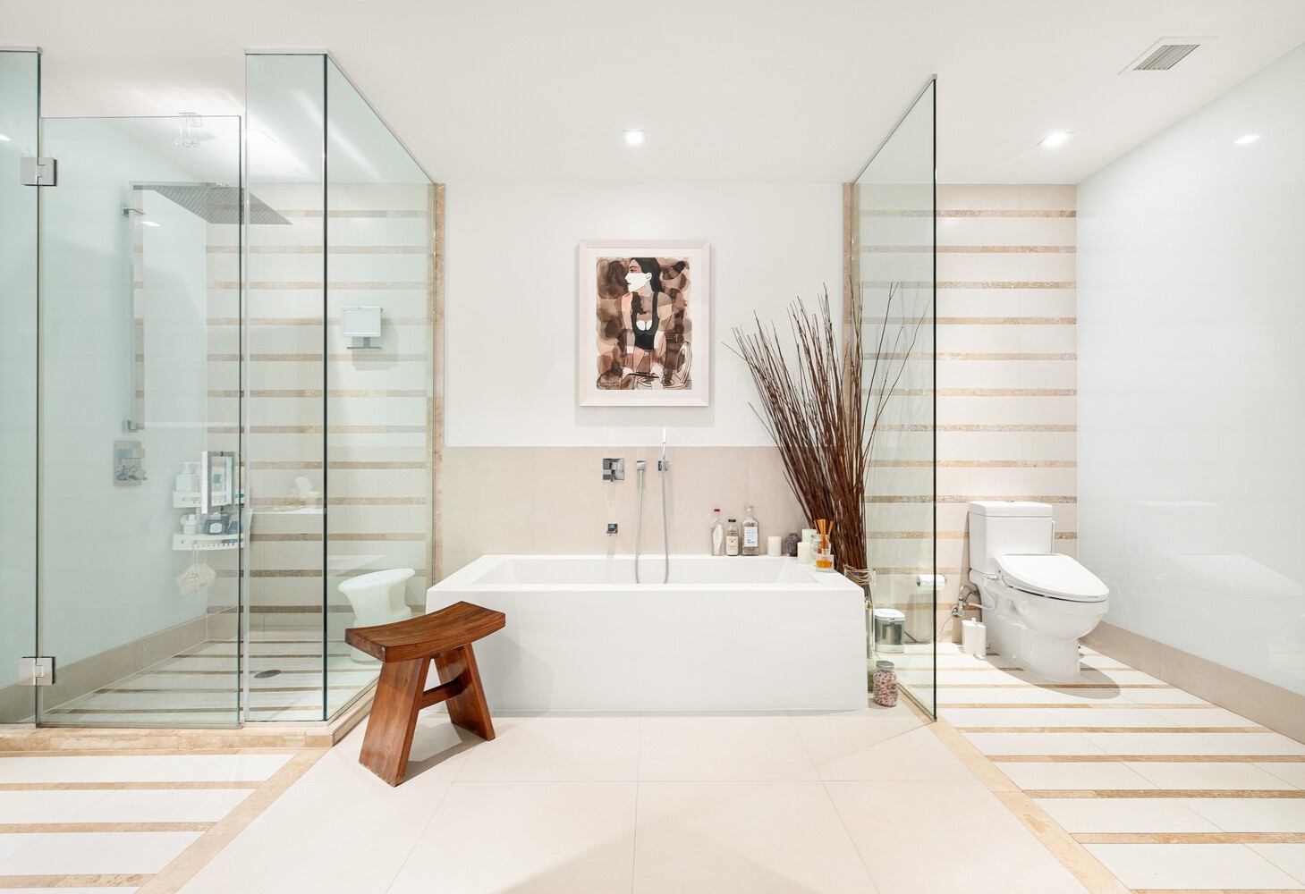 The primary suite features a large walk-in closet and a luxurious en-suite bathroom with a soaking tub, double vanity, and glass-enclosed shower. The second bedroom includes its own full bath, and there's a separate powder room for guests. Additional highlights include a full-size washer/dryer, central air, wide-plank oak flooring throughout, and a private storage locker deeded with the unit.