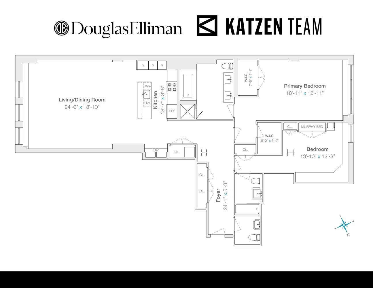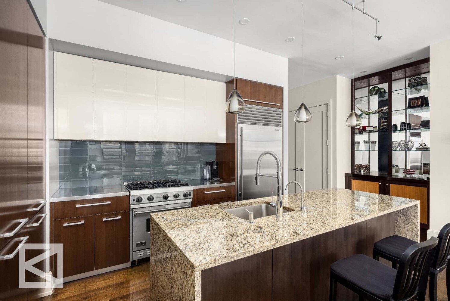 The kitchen has been elevated with six-slab stone surfaces, custom Italian cabinetry, premium Sub-Zero and Viking appliances, instant hot water, and garbage disposal, complemented by beautifully integrated built-in storage directly across. The second bedroom has been thoughtfully customized with bespoke millwork to function as a refined home office with a discreet Murphy bed.
