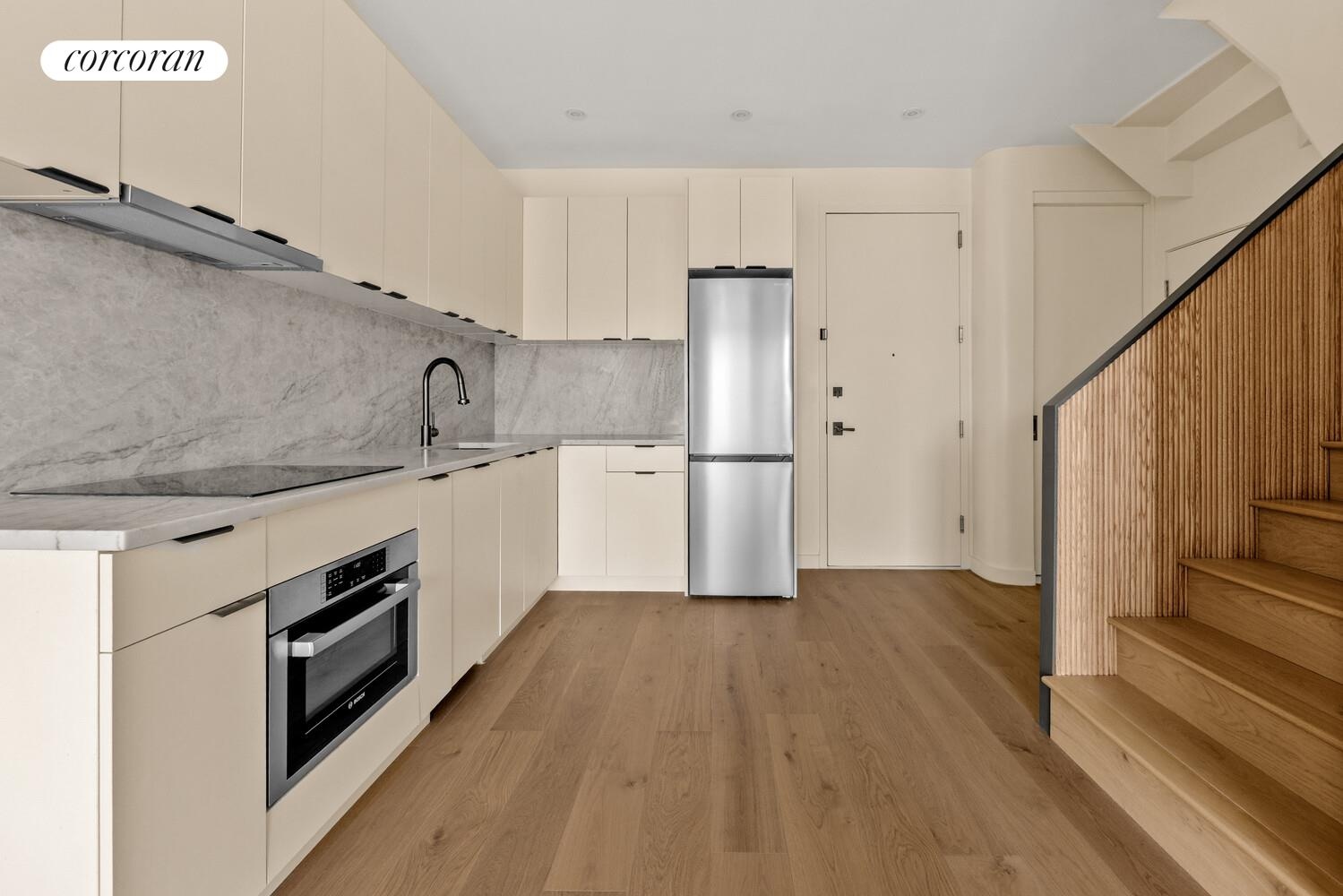 The entry level welcomes you into a bright living and dining area framed by wide plank oak floors and oversized sliding glass doors that lead directly to a curved private balcony. The gentle architectural curve softens the space while allowing natural light to pour in throughout the day. Just off the living area, the kitchen is both elegant and functional, featuring custom cabinetry in warm neutral tones paired with Quartz Taj Mahal stone used for both the countertop and full-height backsplash. Integrated appliances and sleek matte black fixtures complete the space, creating a kitchen that is as refined as it is practical.