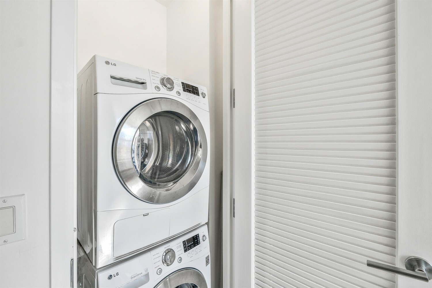 Premium Grohe and Kohler fixtures and oak floors run throughout, and the well-conceived split-bedroom layout ensures privacy, with bedrooms positioned on opposite ends of the home. Both bathrooms have been beautifully updated with ceramic and marble tile finishes. An in-unit LG washer and dryer, energy efficient water heat pump system, as well as smart home technology and individual climate control systems add everyday convenience. Ideal as a primary residence, investment property, or a refined pied-à-terre.