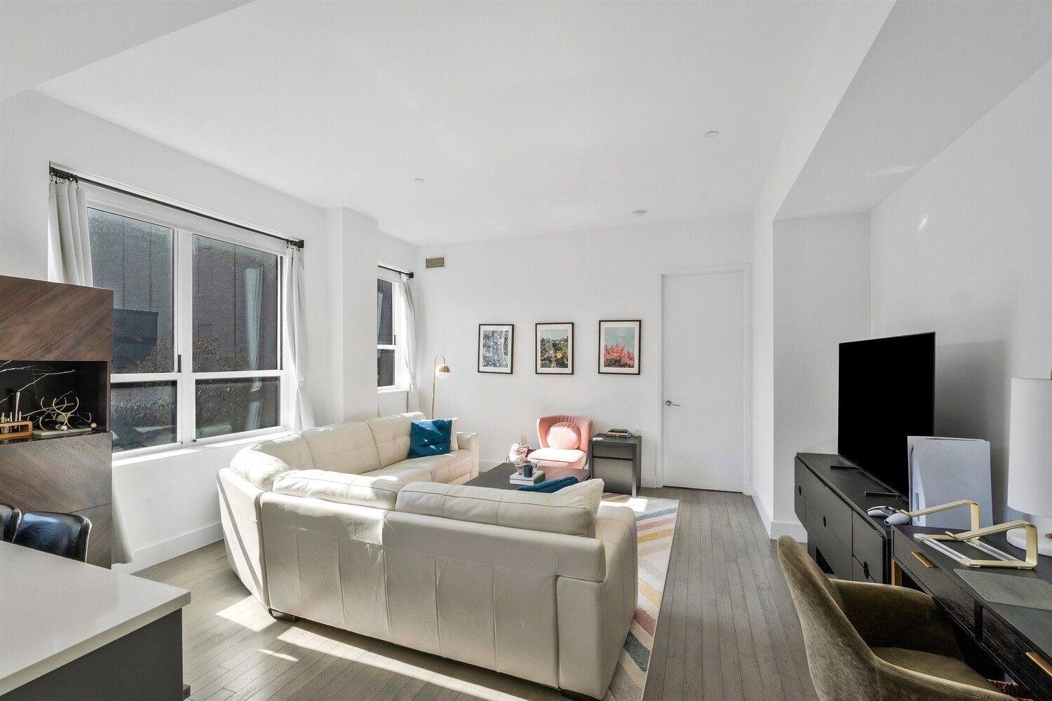 Welcome to Residence 514 at Nine52, a sophisticated 2-bedroom, 2-bath condo offering nearly 1,100 square feet of light-filled, thoughtfully designed living space in the heart of Hell's Kitchen. Tall windows bathe the open-concept living and dining area in natural light, creating an airy, modern ambiance. The sleek kitchen is appointed with KitchenAid stainless steel appliances and Caesarstone countertops, as well as well-designed built-in storage.
