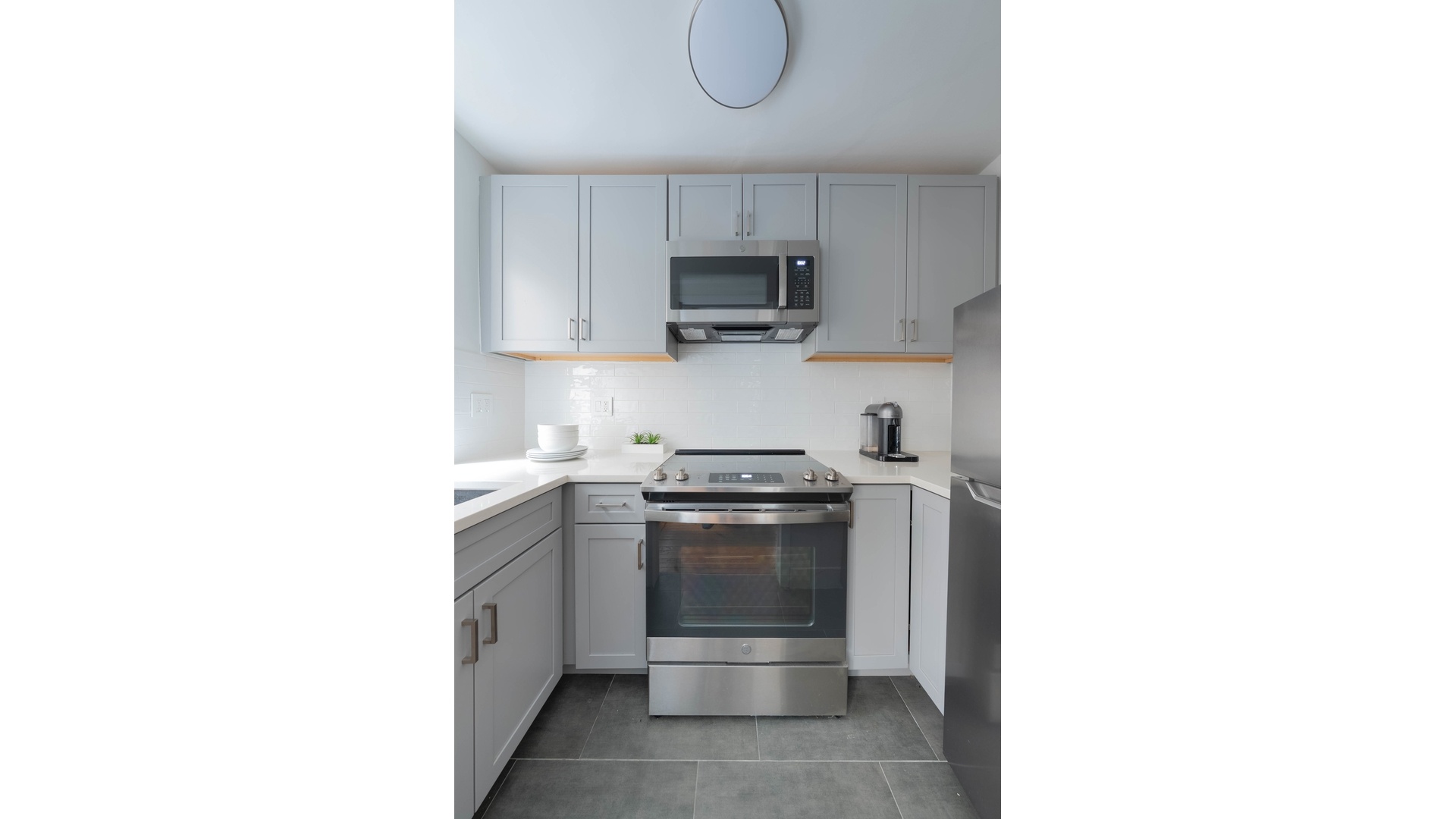 The windowed kitchen has been stylishly renovated with top-of-the-line stainless steel appliances and sleek modern finishes, offering both beauty and functionality. The bathroom is thoughtfully appointed with crisp white tile, a shower/tub combination, and a vanity providing additional storage.