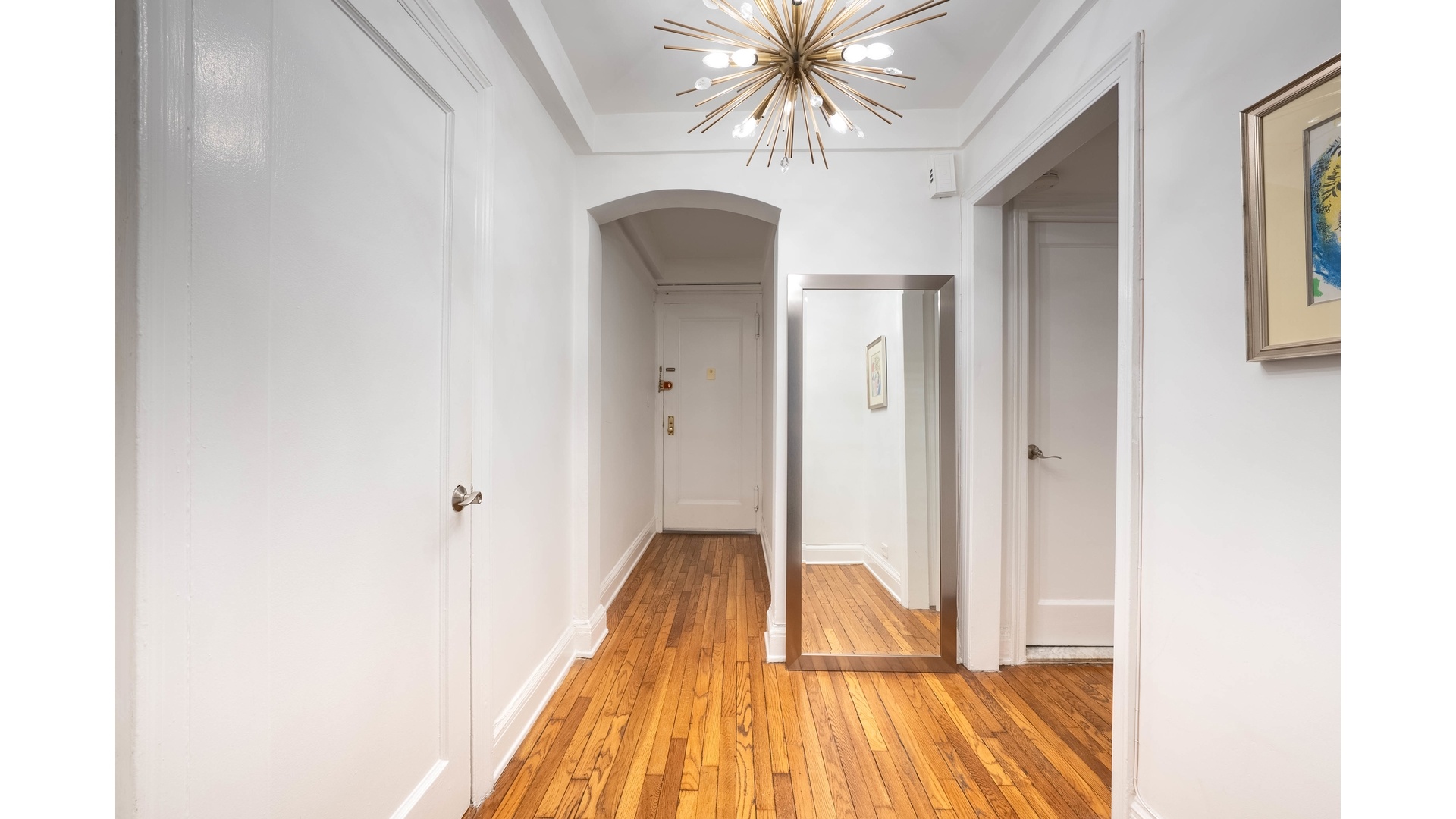 A gracious entry foyer, complete with a large coat closet, sets the tone upon arrival. An arched doorway opens into an expansive living room where classic crown moldings, soaring ceilings, and rich hardwood floors create a sense of understated grandeur. The scale of the room easily accommodates both living and dining areas, ideal for entertaining or quiet evenings at home. A generously sized walk-in closet adds exceptional storage rarely found in a one-bedroom home.