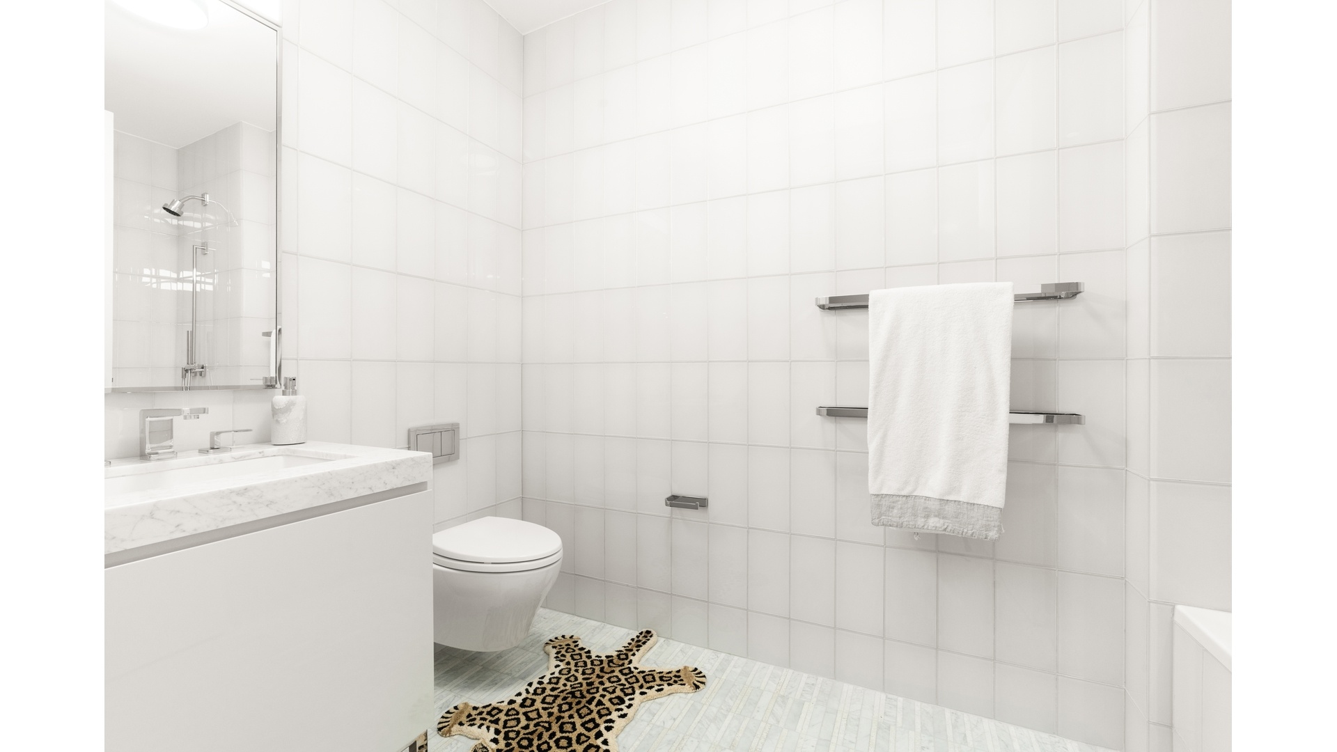 The 2nd en-suite bedroom is fitted with a custom lacquered vanity w/ Carrara marble countertop, Dornbracht polished chrome fixtures, Americh drop-in soaking tub with glass tile apron, wall-mounted Duravit toilet, marble blend mosaic floor, and white glass tiled walls.
