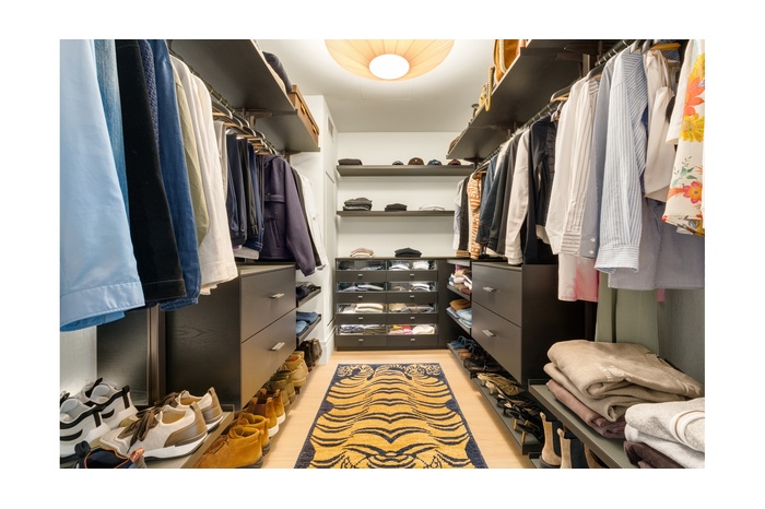 Spacious primary bedroom with customized oversized walk-in closets. The en-suite spa like bathroom features wood-veneered vanity, Bianco Dolomite marble walls and countertops, a Grigio Carnico marble floor, and Dornbracht polished nickel fixtures. Indulge in a deep soaking tub, a rain shower and separate water closet.