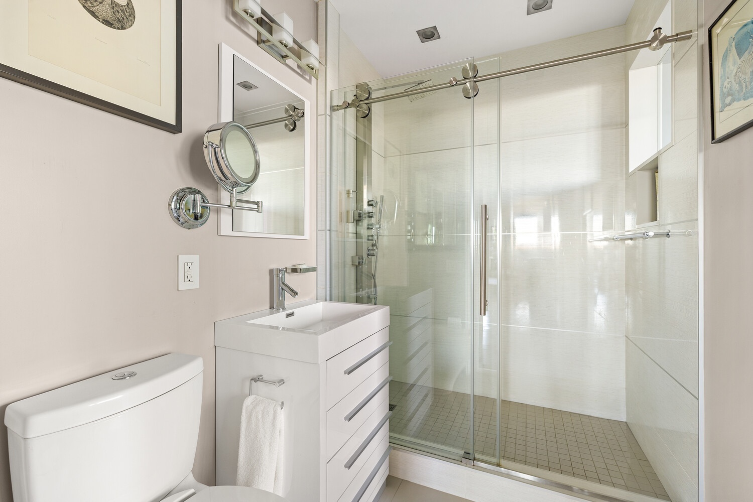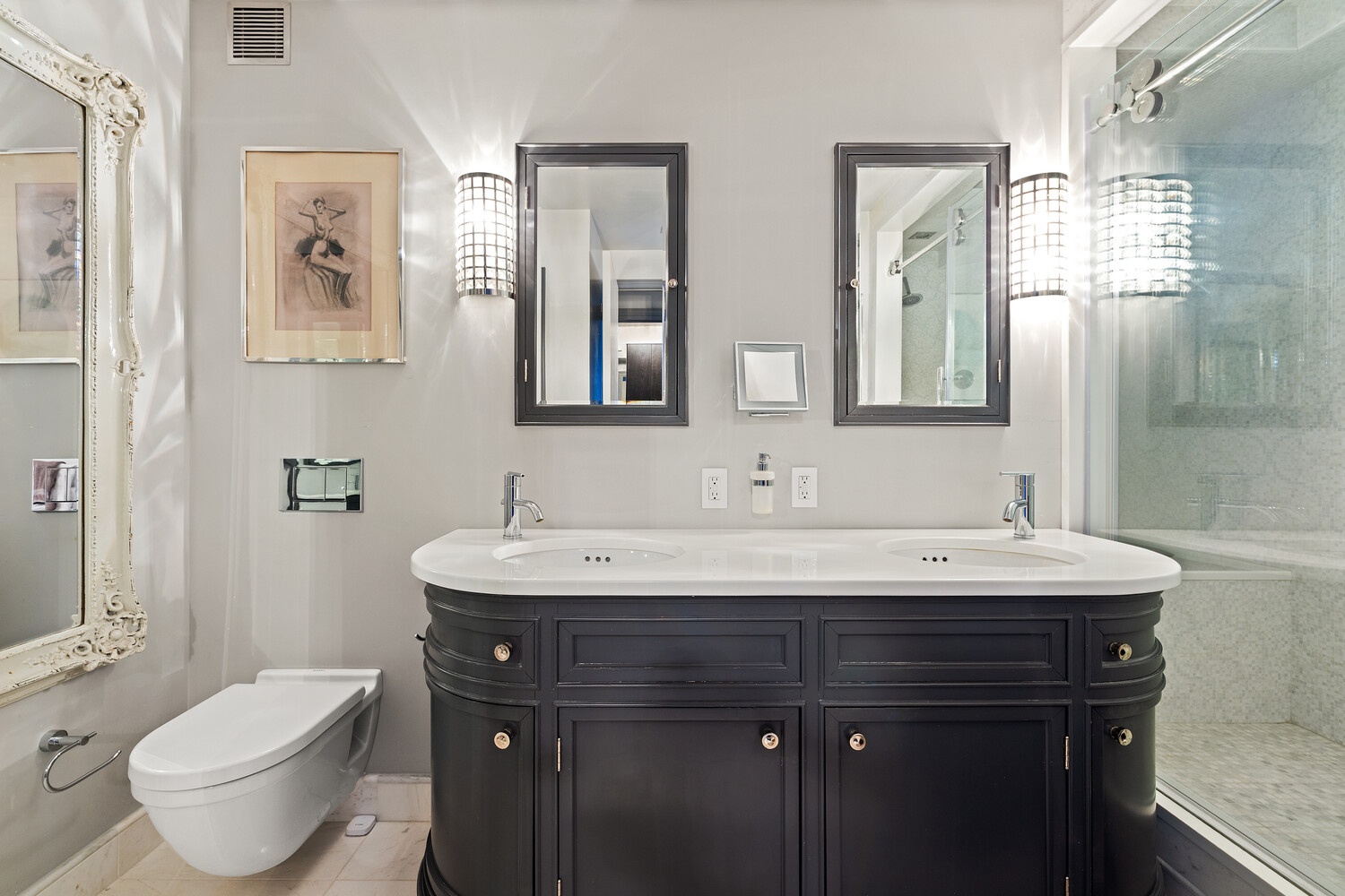 The primary suite enjoys direct access to the terrace, generous custom closets, and a serene en-suite bathroom with a double walk-in shower, jetted soaking tub, and wall-hung Duravit toilet. Three additional bathrooms, each uniquely finished, include an en-suite guest bath tucked within a separate bedroom wing for added privacy.