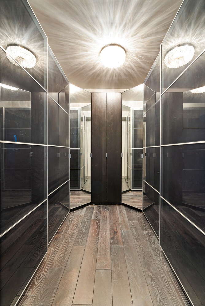 The windowed chef's kitchen pairs floor-to-ceiling Leicht cabinetry with a full suite of Miele appliances, including a six-burner gas cooktop, wall oven, and refrigerator. A Thermador wine tower holds up to 70 bottles, making it perfect for collectors or entertainers.