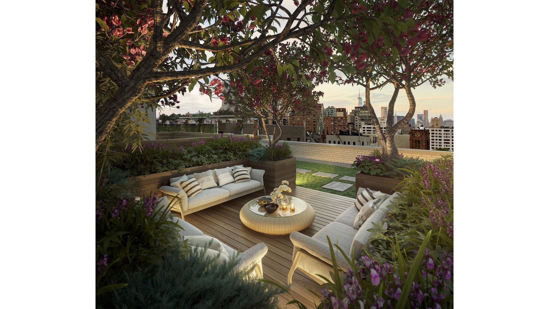 The private rooftop terrace, designed by M. Paul Friedberg & Partners, offers sweeping north, south, and west exposures with iconic views of the Chrysler and Empire State Buildings. Landscaped with lush plantings and an ipe wood deck, the terrace includes a built-in lounge area, trellised dining space, and outdoor kitchen with gas grill and wet bar.