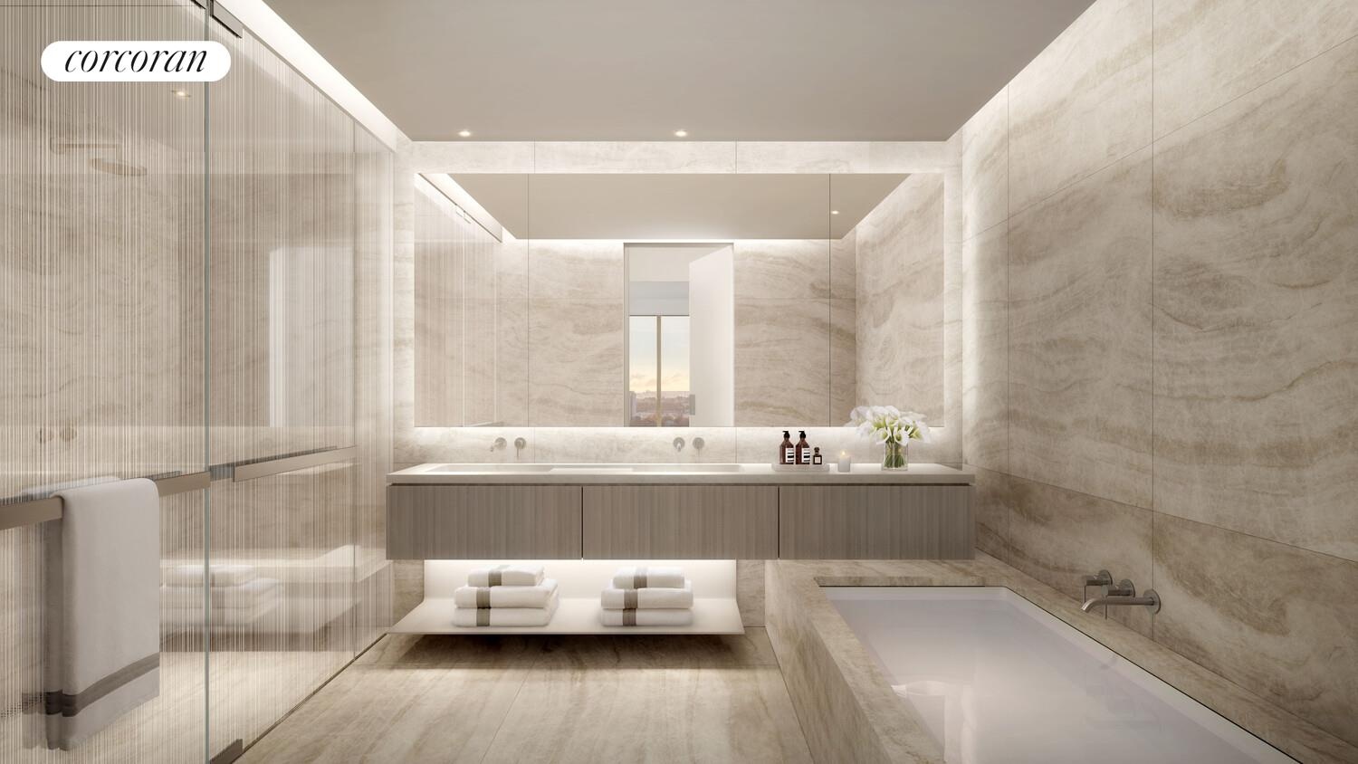 West 24B is equipped with a signature powder room adorned in vein-cut Grigio Onyx, ample storage and closet space, utility room with premium washer-dryer and a state-of-the-art home automation system by Kraus Hi-Tech.