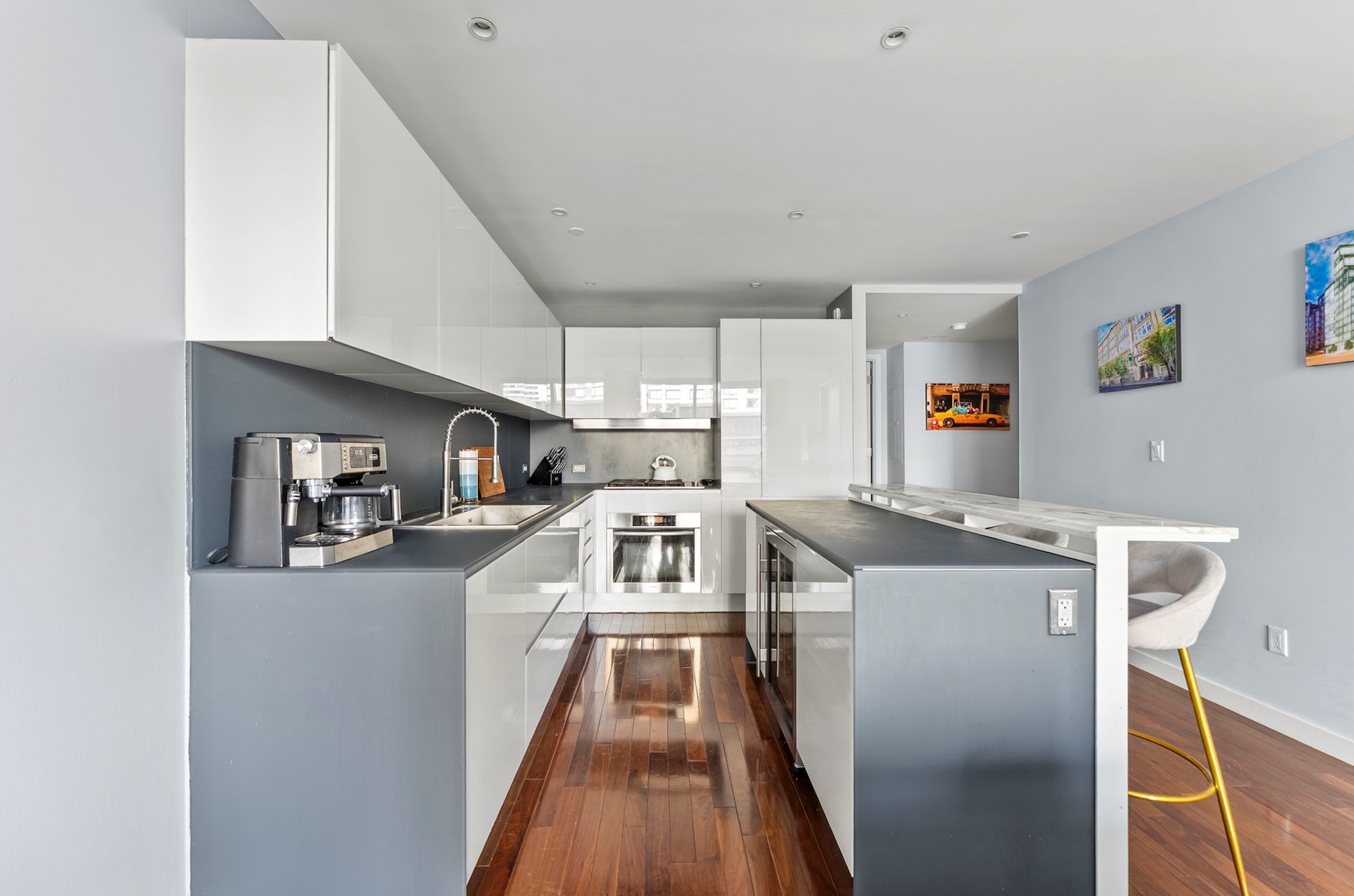 A gracious entry foyer leads to the open living and dining area, seamlessly connected to a chef caliber kitchen with a large breakfast bar. Fully equipped with top-of-the-line appliances, including a Sub-Zero refrigerator, Miele gas range, Miele dishwasher, and wine fridge.