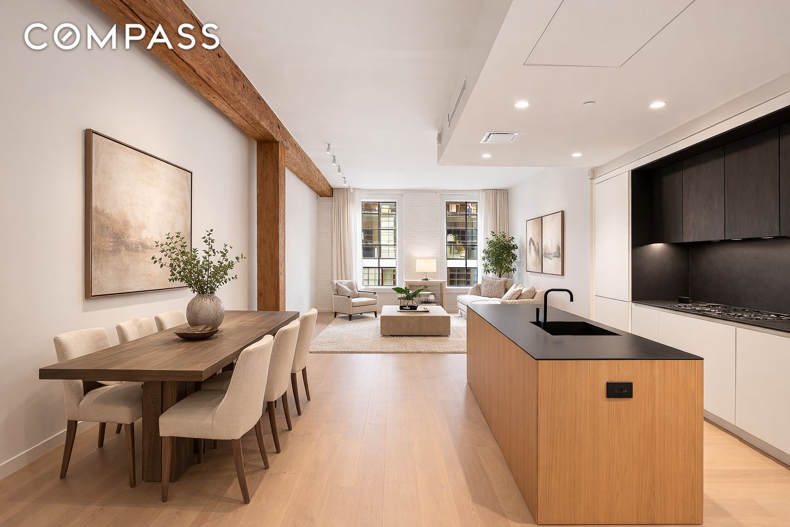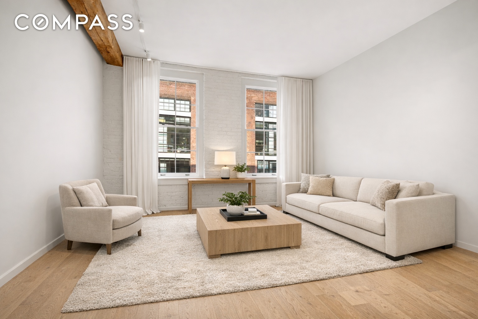 Original longleaf pine beams, restored whitewashed brick, wide-plank oak floors, and 11-foot ceilings set a warm, architectural tone throughout. Oversized north-facing windows deliver consistent light and classic DUMBO warehouse views without sacrificing privacy or quiet.