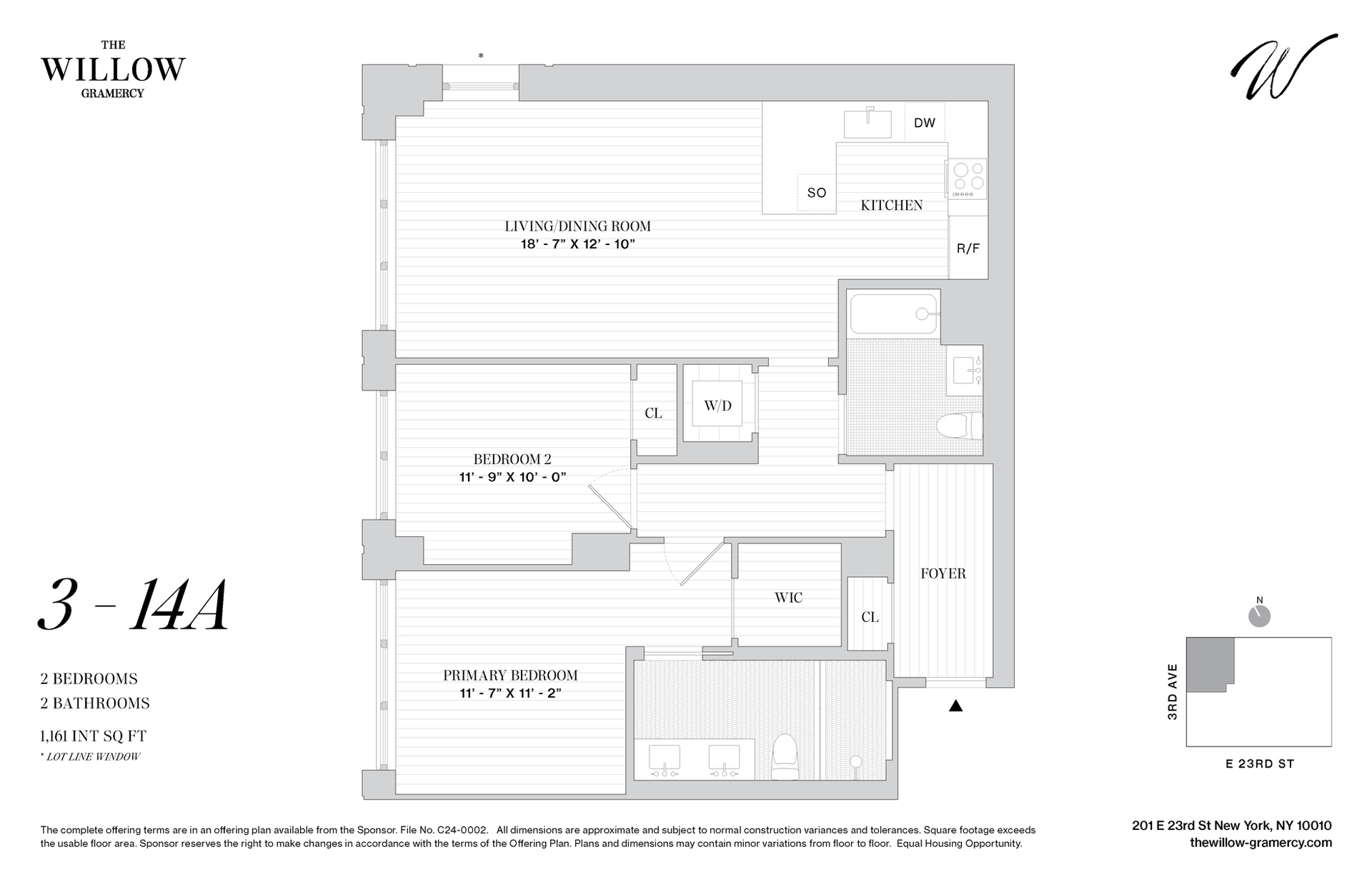 CLOSINGS COMMENCE THIS SPRING. Over 65% Sold. Residence 11A is a charming two-bedroom, two bathroom home. With expansive west-facing divided light windows, the apartment is filled with natural light, highlighting the elegance of the wide-plank oak flooring throughout. A private foyer leads into the thoughtfully designed space, featuring an open concept kitchen, living, and dining area. The kitchen, beautiful and carefully designed, is open to the living area but set back to maintain separation. The primary bedroom suite feels private and luxurious with generous closet space and a double vanity in the bathroom. A full size washer and dryer complete this special two bedroom home.