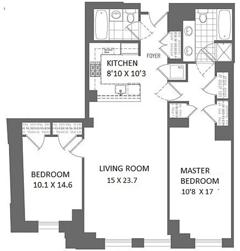 Quintessential loft living high in the sky. Spanning 1325 square feet and beamed 10ft ceilings throughout, this two-bedroom, two-bathroom home is bright, airy and classic. Two large west-facing windows offer gracious light all day and breath-taking sunset views at dusk. Easily separated into a dining area and a seating area, the living room is proportioned generously. The spacious chef’s kitchen is equipped with all Viking appliances and ample storage/counter space. Speaking of closets, there are six organized closets! The primary bedroom boasts a luxurious five-fixture en-suite bathroom with deep soaking tub and double vanity. A work station is easily accommodated in the outsized primary bedroom, in addition to a king bed and two night stands.