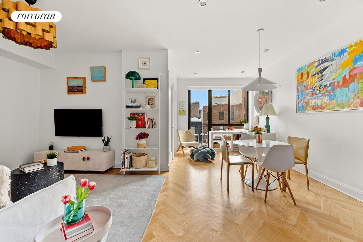Bright, inviting, and beautifully designed, this south-facing one-bedroom feels like home the moment you step inside. Sunlight pours through oversized windows, highlighting the open layout and elegant white oak herringbone floors.
