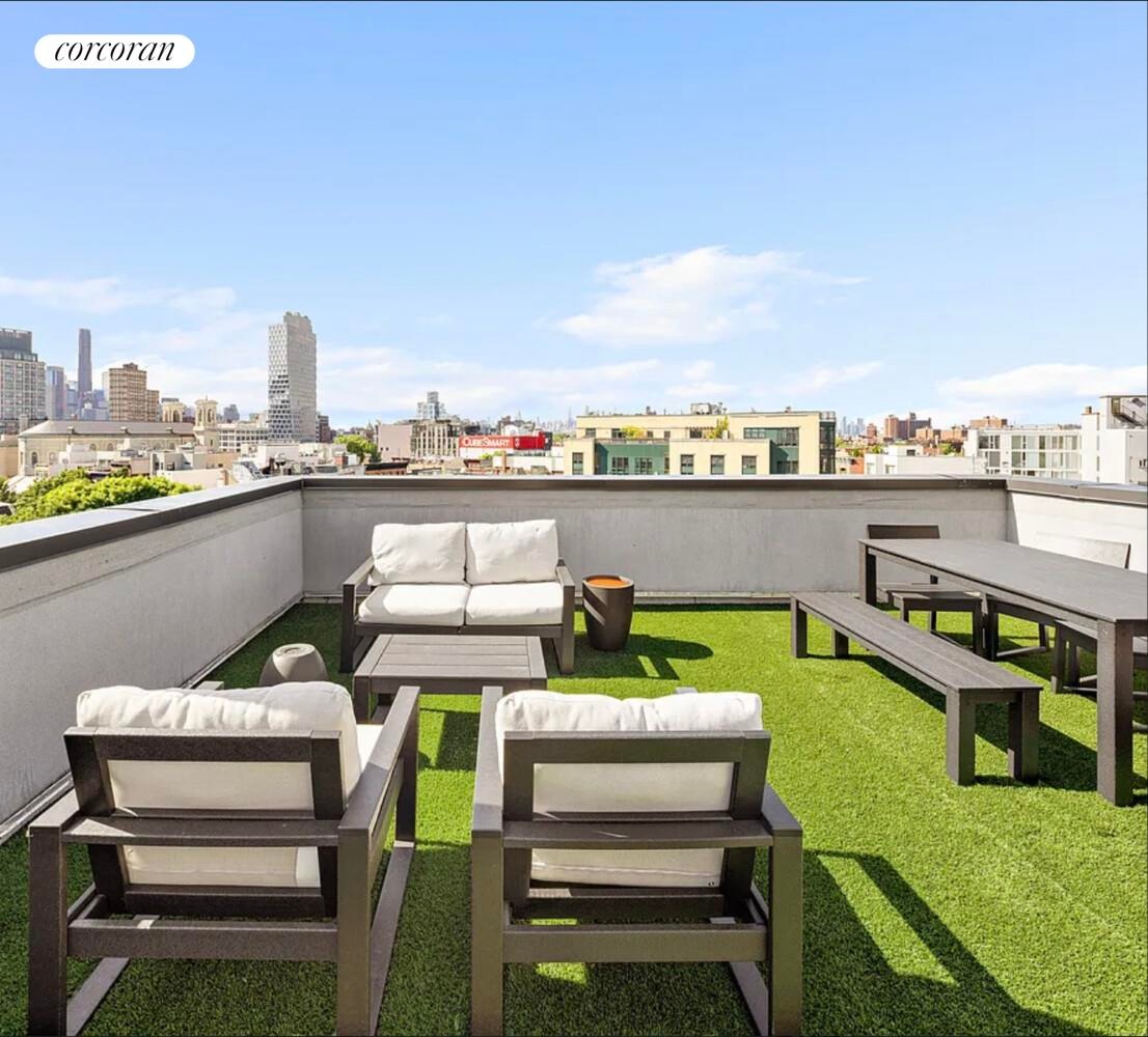 The spacious L-shaped living space offers flexibility for relaxing, entertaining, dining, or working from home. Step outside to your private terrace overlooking Bergen Street-perfect for plants, outdoor dining, or a quiet escape. The spa-like bathroom features marble finishes, radiant heated floors, a soaking tub, and custom vanity.