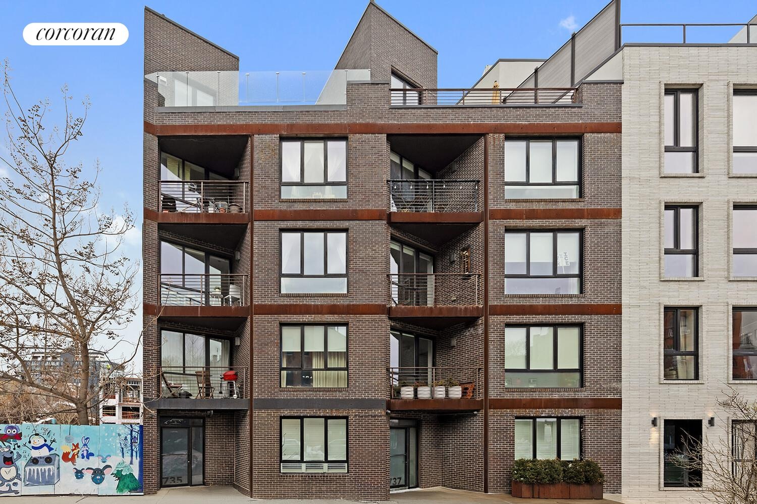 Part of the Bergen Modern Complex at 735 Bergen Street, a boutique condo with 8 units, the building includes an elevator, video intercom, and spacious shared roof deck with skyline views.