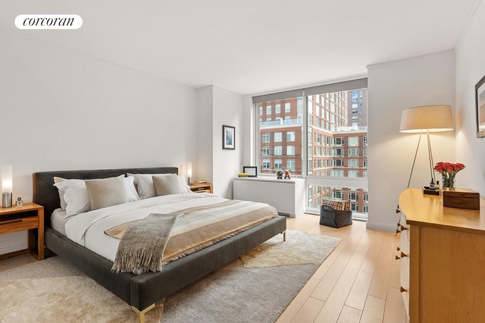 Welcome to River & Warren. This mint-condition two-bedroom, two-and-a-half-bathroom residence is flooded with natural light from oversized floor-to-ceiling windows throughout. The expansive living and dining area offers open eastern views and flows seamlessly into a sophisticated chef's kitchen, creating an ideal setting for entertaining. A private storage bin is included with the home. The kitchen features Calacatta marble countertops, Sub-Zero refrigerator and wine refrigerator, Miele gas cooktop, oven, and dishwasher, along with custom cabinetry. The primary suite is a serene retreat with a spa-like en-suite bath featuring Waterworks fixtures, Blanco Puro marble walls, a custom white oak vanity, soaking tub, and separate glass-enclosed shower. The generously sized second bedroom also enjoys open park views. Additional highlights include 5-inch wide-plank oak flooring and a dedicated laundry room with Bosch washer and dryer.