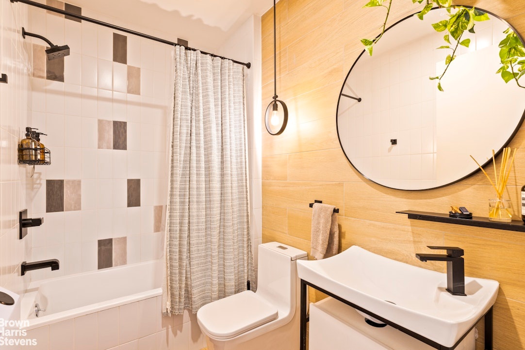 The primary bedroom can comfortably accommodate a king size bed. Both bedrooms offer generous closets, while the full bath includes matte black fixtures and a deep soaking tub. Boutique amenities include a virtual doorman and shared rooftop deck.