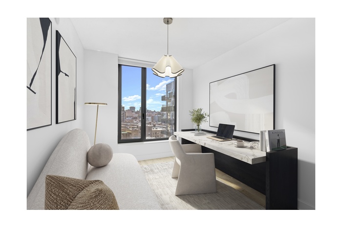 This sun-filled penthouse features an intelligently designed layout highlighted by soaring ceilings, oversized windows, and abundant natural light throughout. The open living and dining area flows seamlessly into a beautifully appointed chef's kitchen outfitted with sleek custom cabinetry, elegant stone countertops, and a premium Bosch appliance suite. Wide-plank flooring and clean architectural lines create a refined yet comfortable aesthetic that perfectly balances modern design with everyday functionality.