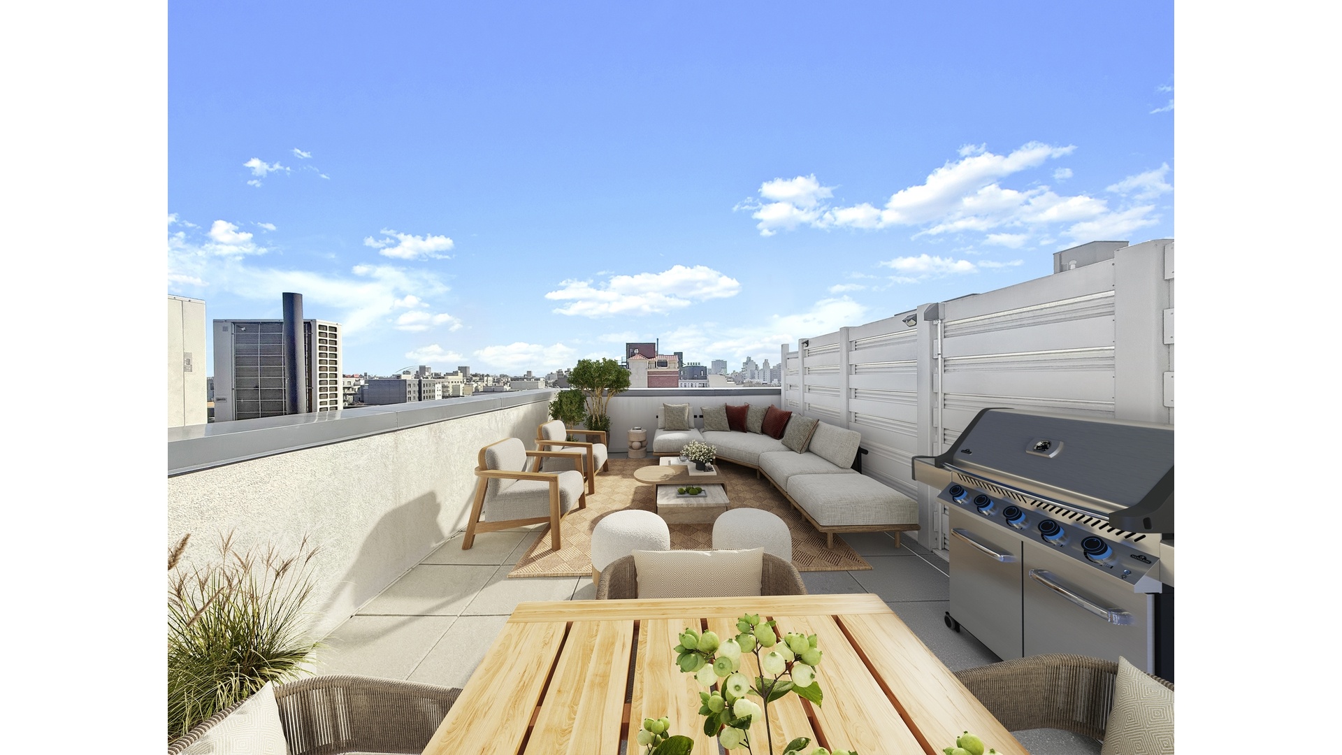 A defining feature of this penthouse is the internal staircase leading to your private roof terrace, where sweeping panoramic views stretch across the Brooklyn skyline and toward Manhattan. Designed as a true extension of the interior living space, this expansive outdoor retreat includes a Mont Alpi island with a gas grill, creating the perfect setting for morning coffee, sunset gatherings, or effortless outdoor entertaining high above the city.