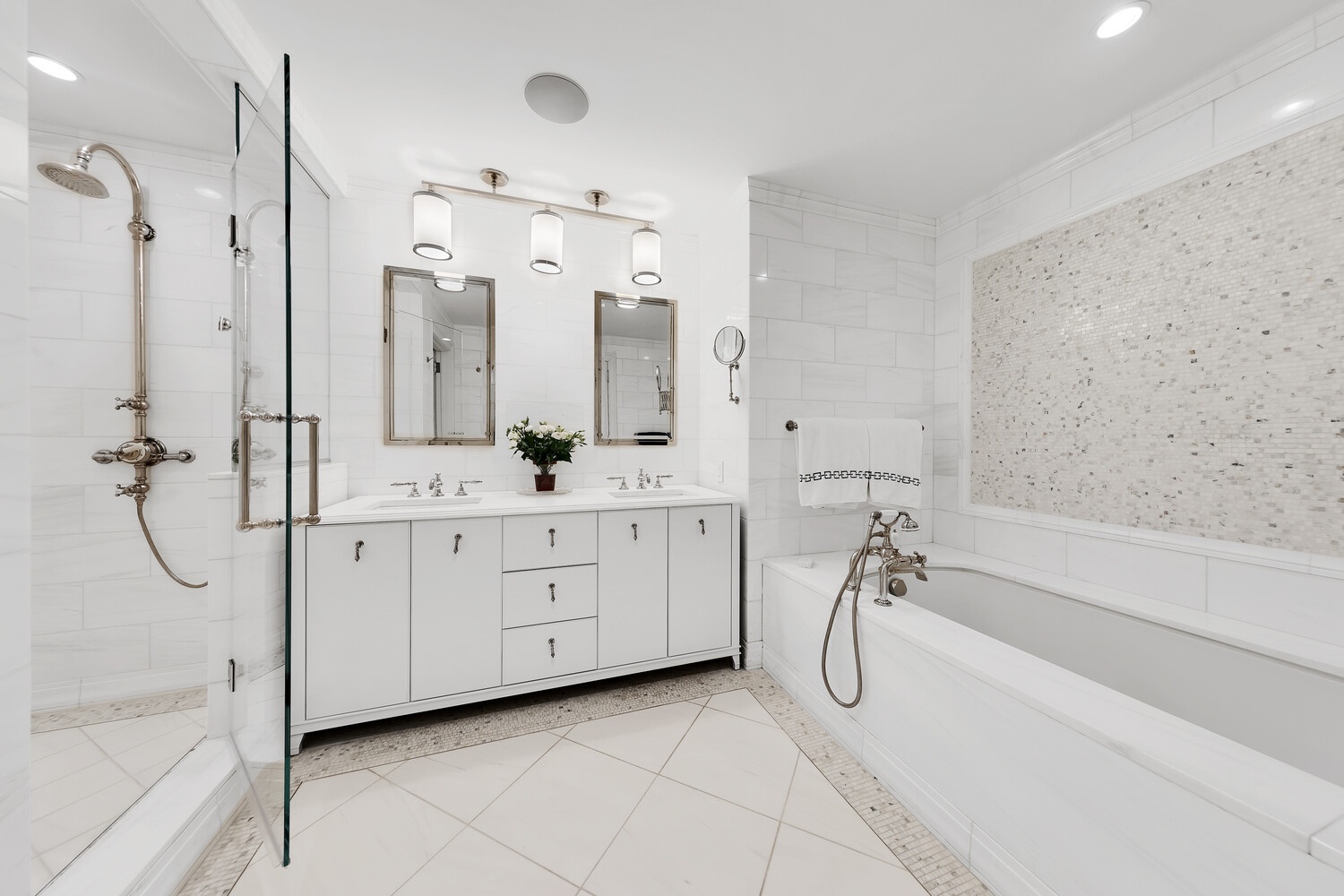 The private bedroom wing is accessed via an elegant hallway, ensuring complete privacy and separation from the living areas. The primary suite is an indulgent retreat, showcasing two expansive walk-in closets and a spa-inspired bathroom adorned with Calacatta and Thassos marble, Waterworks fixtures, dual sinks, separate glass shower, a deep soaking tub, and radiant heated floors. Four additional bedrooms, each with its own en-suite bathroom, provide both privacy and luxury for household members, guests or live-in help. Additional conveniences include a powder room, abundant closet space in all bedrooms and hallways, a double washer/dryer, and a state-of-the-art central air conditioning system.