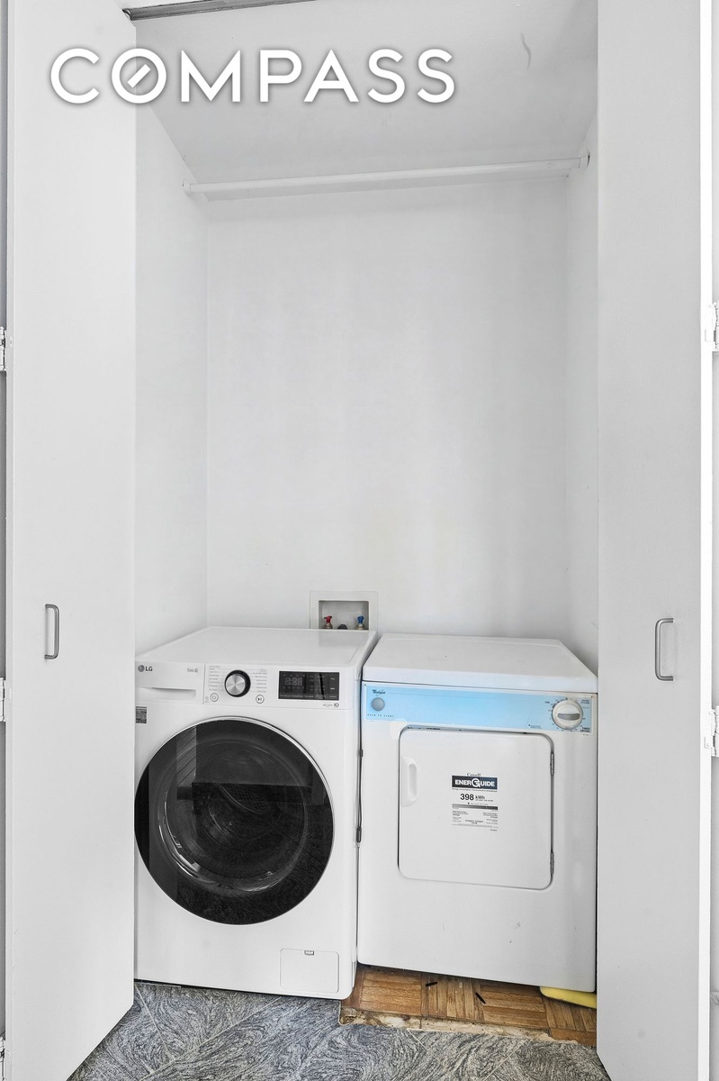 The apartment enjoys tons of sunlight from western-facing windows with Hudson River views; in-home washer and dryer, a dishwasher, microwave and central a/c and heating.
