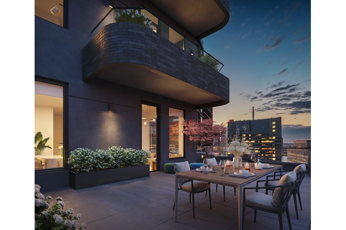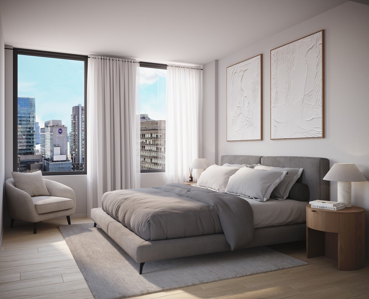 A split-wing layout ensures privacy for both bedrooms. The primary suite can accommodate a king-size bed and includes a reach-in closet and a pristine en-suite bathroom with porcelain floors, a floating Alpi Wood double vanity, a wall-mounted toilet, and a walk-in shower. It also has access to a private east-facing terrace perfect for sun lounging, urban gardening, morning and evening beverages, and more.