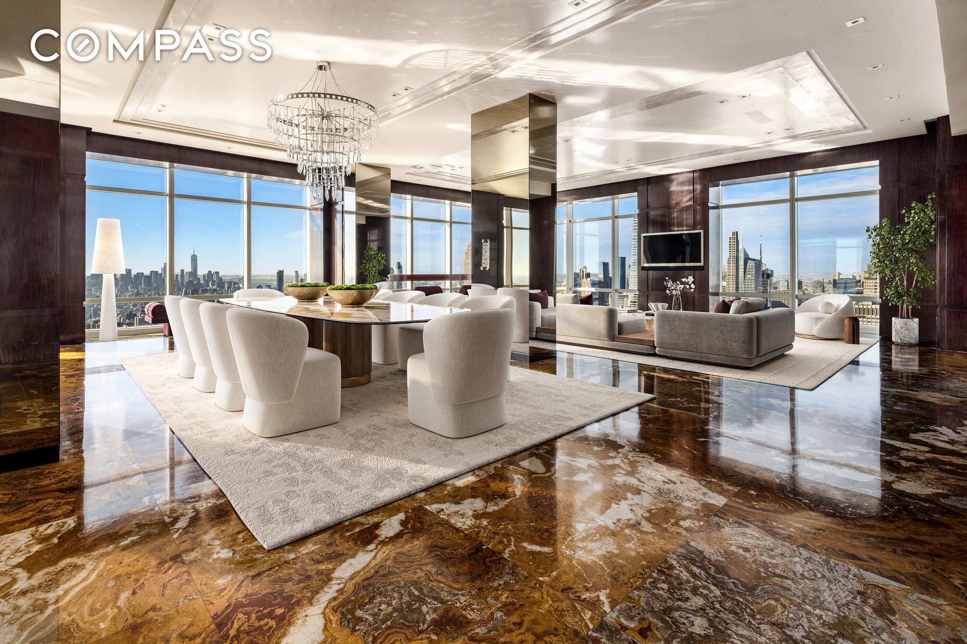 A gracious Italian marble entry gallery leads seamlessly into an expansive open living and dining area, framed by over 76 feet of south-facing windows that flood the space with natural light and capture dynamic city vistas. The layout offers exceptional flow and flexibility, equally suited for formal entertaining and comfortable daily living.