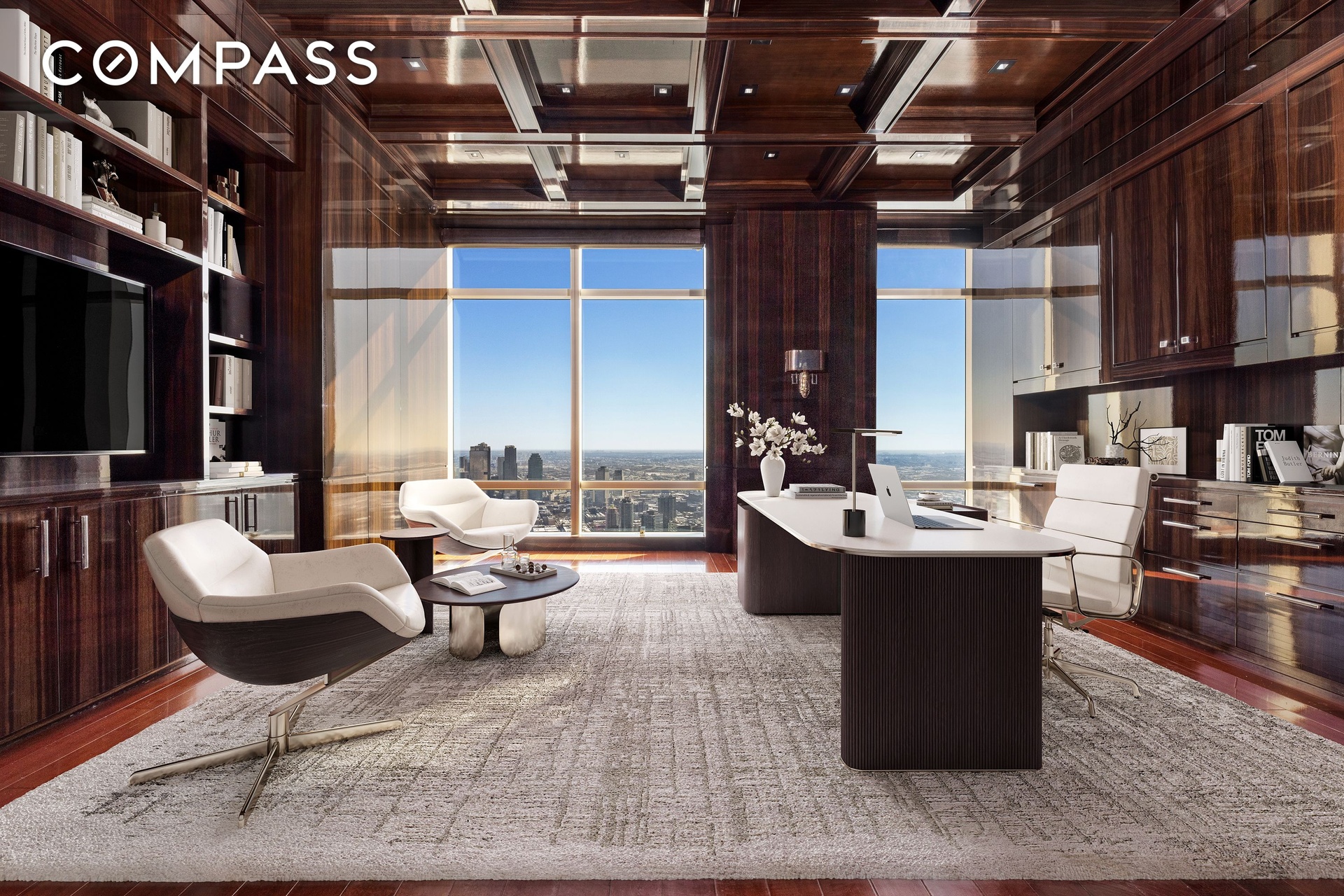 The eat-in kitchen is both functional and refined, featuring custom cabinetry and premium appliances including a Sub-Zero refrigerator and wine cooler and Wolf cooking appliances. Additional highlights include a dedicated laundry room, abundant custom storage, central air conditioning, 12-foot ceilings, rosewood floors, and a fully integrated Crestron smart home system controlling lighting, electric shades, and sound throughout.