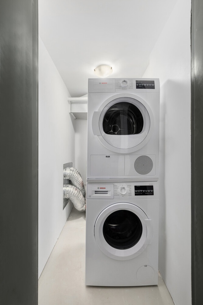Washer dryer in unit, dishwasher, and central AC. A large, private storage unit is included in the basement at no additional charge ( there is a $5 monthly license fee which is included in the advertised common charges).