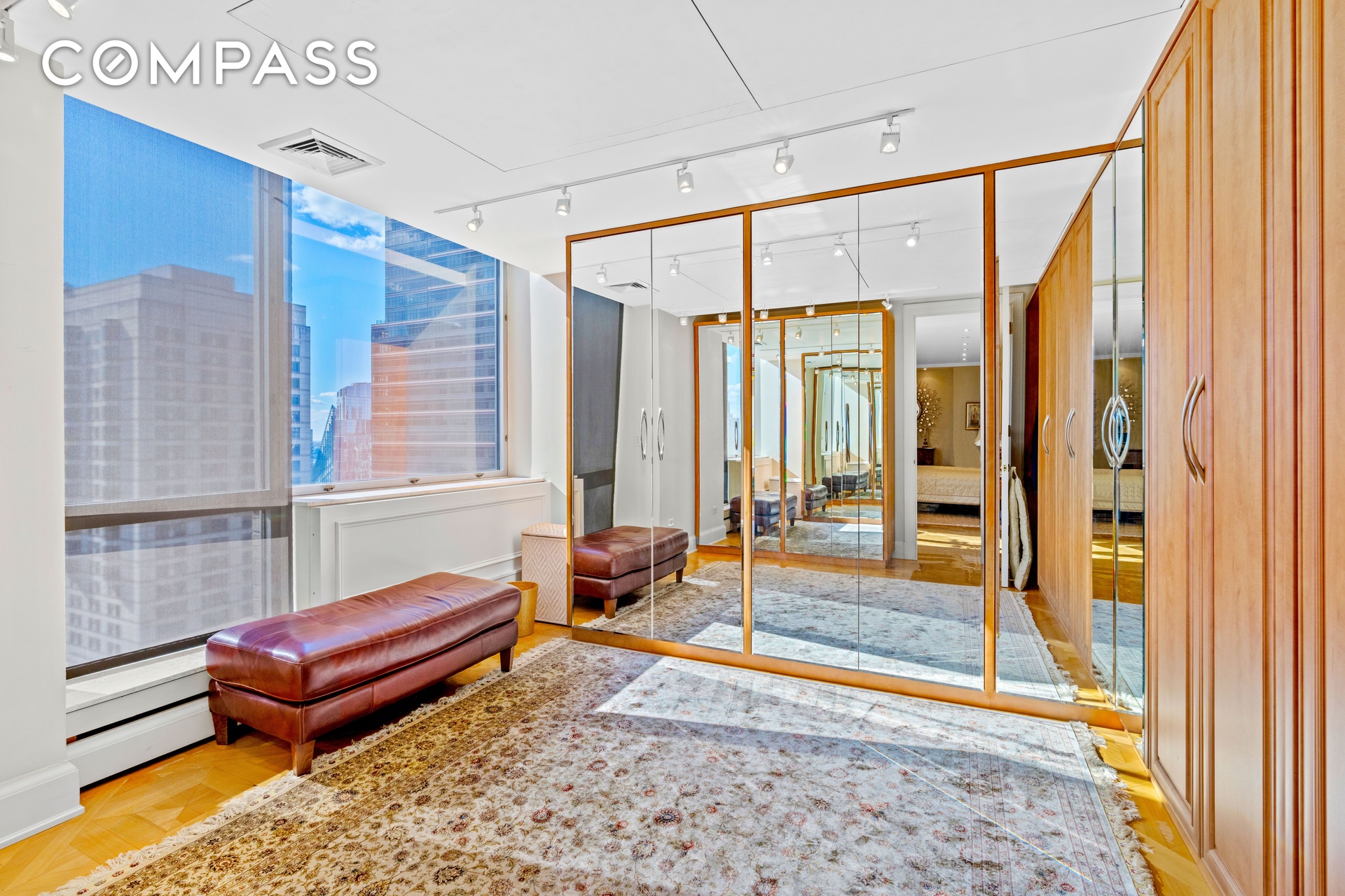 The primary suite is a serene retreat with western exposures, a sunlit dressing room with custom cabinetry, and a luxurious marble bathroom featuring heated floors, a soaking tub for two, a steam rain shower with dual heads, and dual vanities. Thoughtfully designed, the owners sacrificed one full bedroom and bath to create the spectacular oversized walk-in closet/dressing room with stunning views of Lincoln Center. This space can easily convert back into an additional bedroom with a full bath if desired. Three additional bedrooms each feature en-suite marble baths and custom closets, and a windowed room serves perfectly as an in-home gym or office.