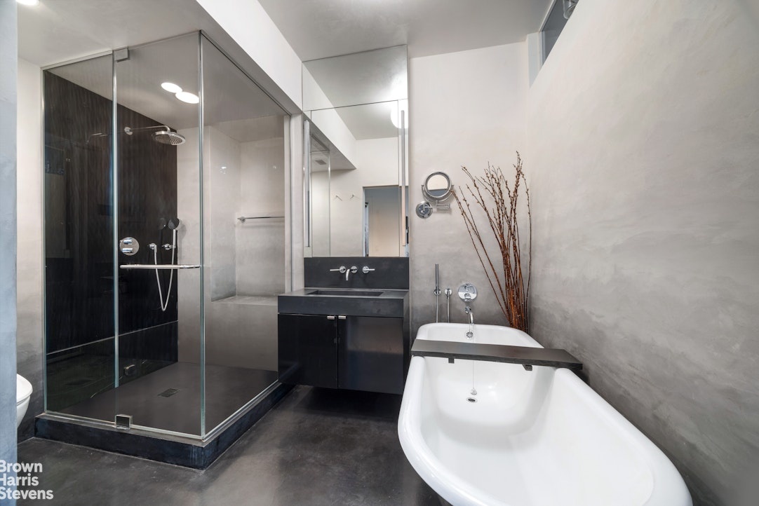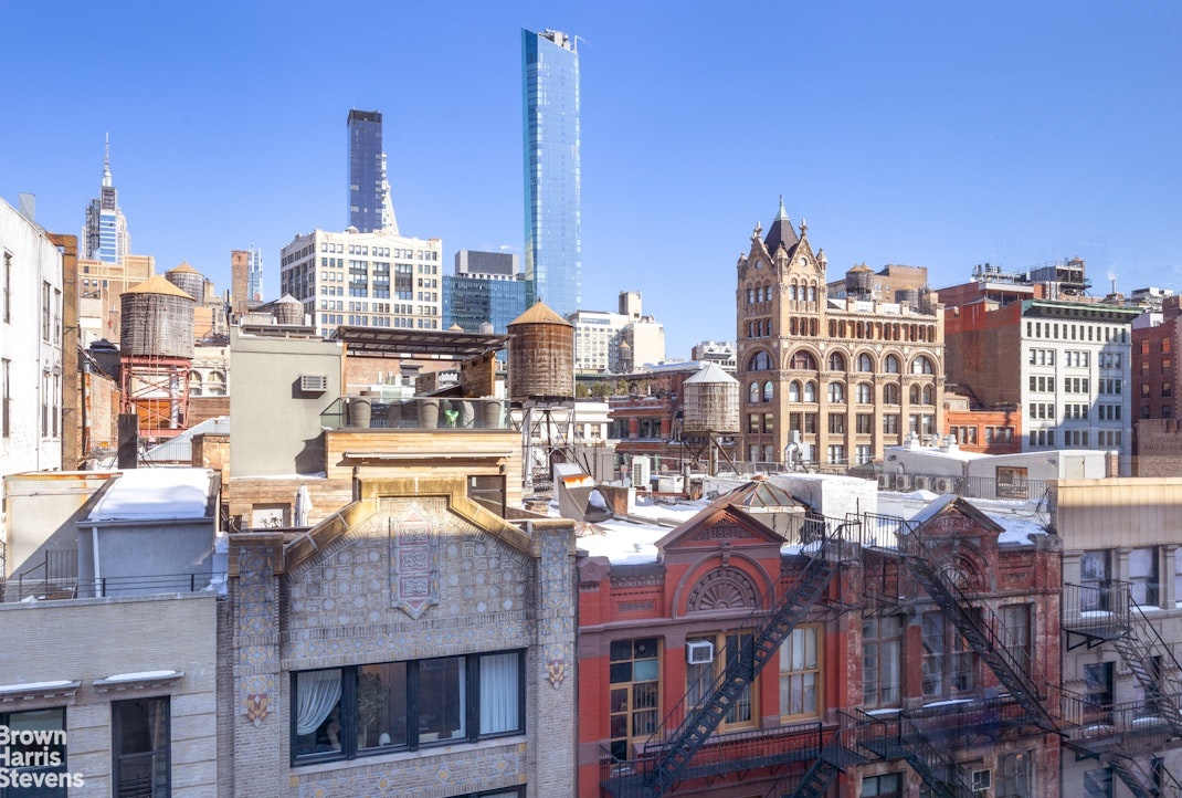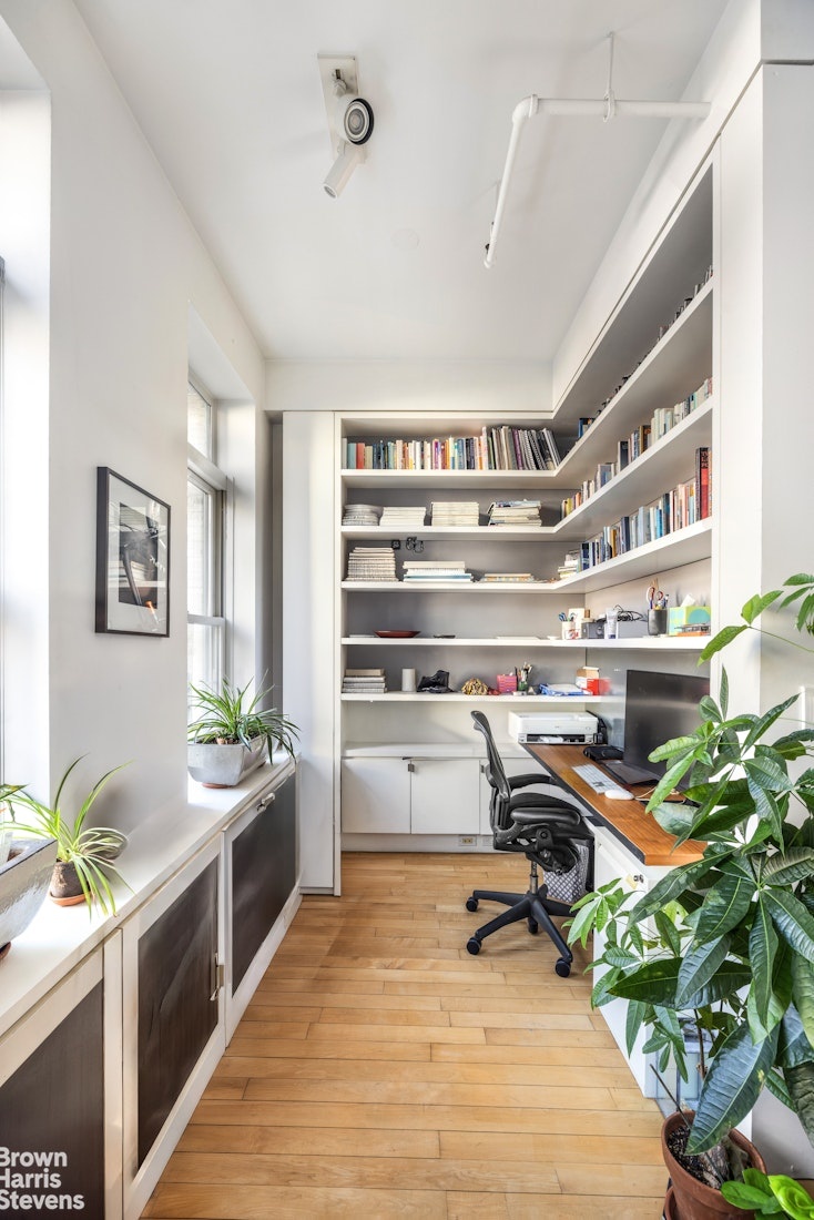 The private bedroom quarters include a spacious primary suite and a well-appointed second bedroom. Both are south-facing and overlook classic NYC fire escape landings, offering lovely midday light and peaceful, quiet surroundings. A spacious custom walk-in closet enhances the comfort and functionality of the space.