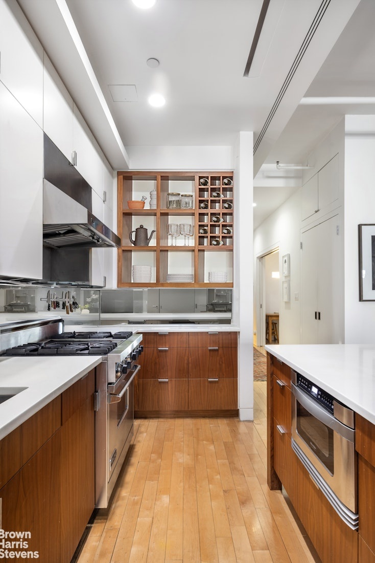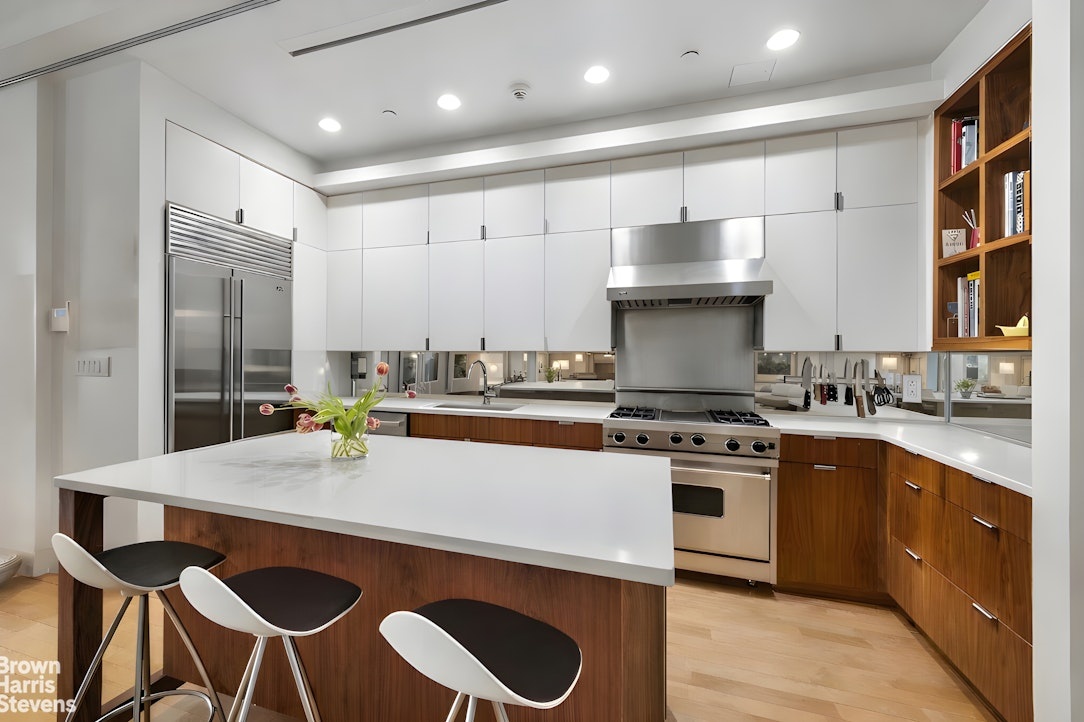 The open chef's kitchen is centered around a substantial island and delivers exceptional counter and storage space. A suite of premium appliances - including Viking Range, Subzero fridge, and Bosch dishwasher - are complemented by custom built cabinetry and walnut shelving, accent lighting and refined countertops, creating a sophisticated culinary space.
