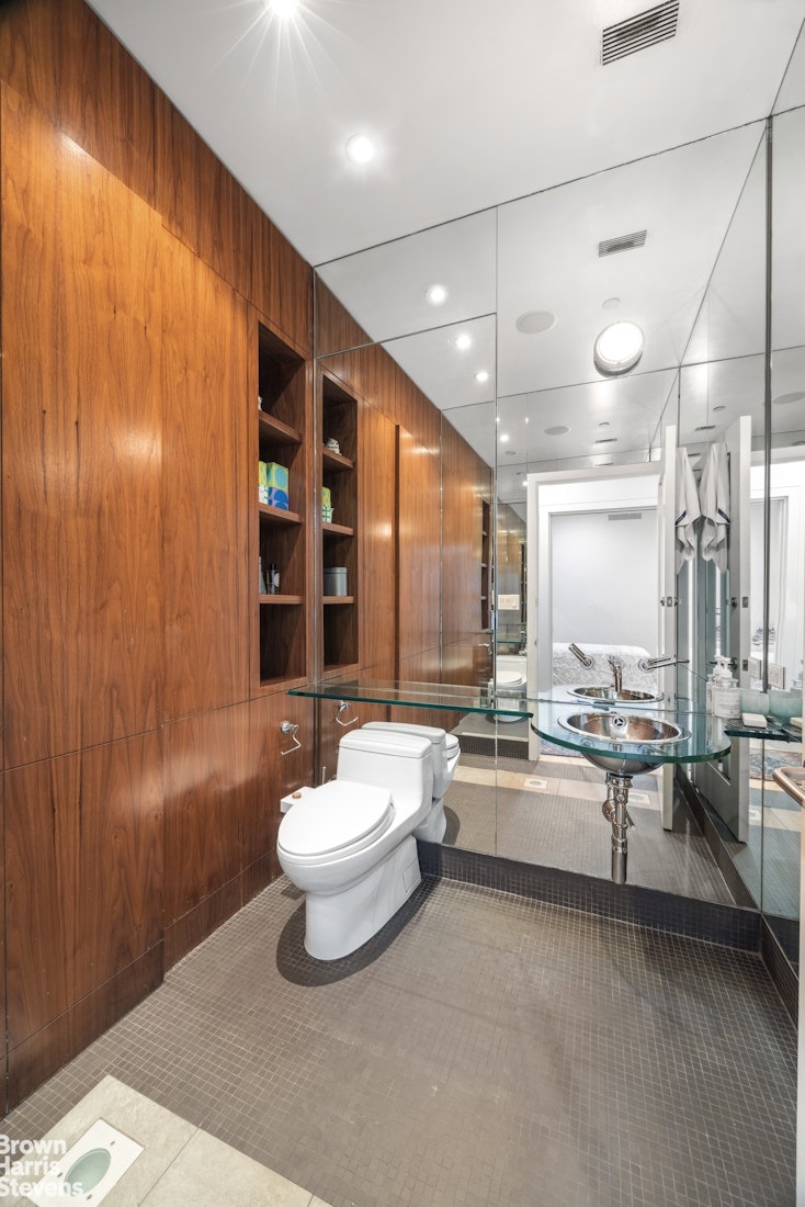 The second full bath is beautifully finished with rich walnut woodwork and cabinetry, wall to wall mirrors, speaker system into the space and in-floor ambient lighting. Both bathrooms offer custom oversized mirrored cabinets and storage with integrated vanity lighting.