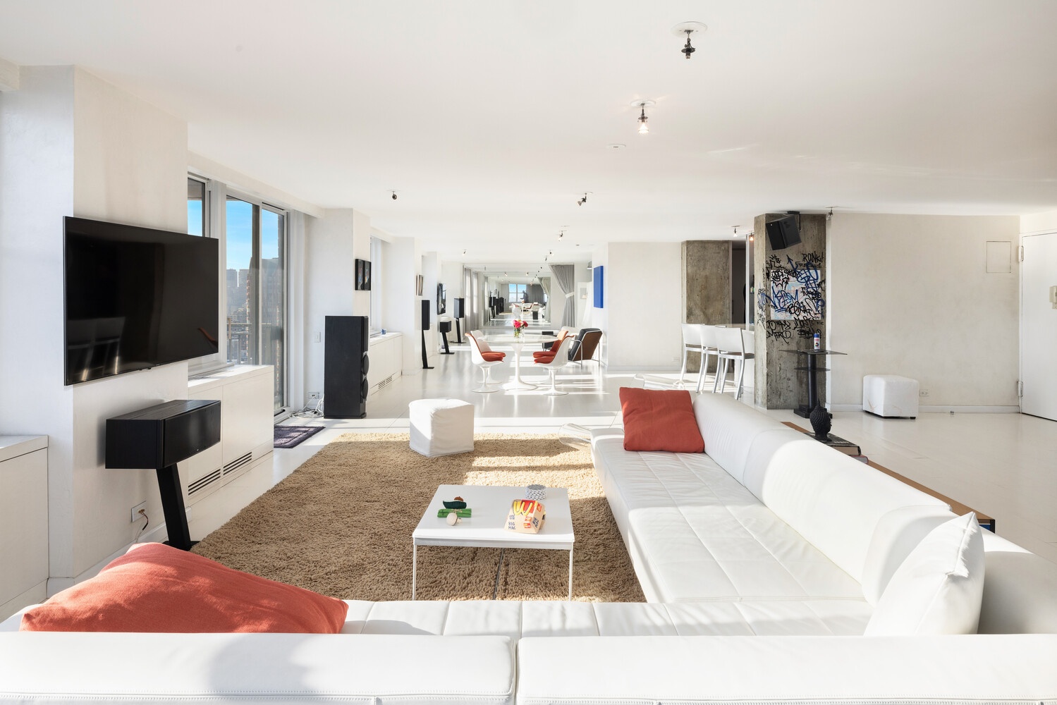 This one-of-a-kind home feels like a Soho Loft. Entertainers will love the 65 foot long interconnected living room, dining room and den! Think about the parties you can have here. This flexible layout accommodates up to 4 Bedrooms and 5 Bathrooms.