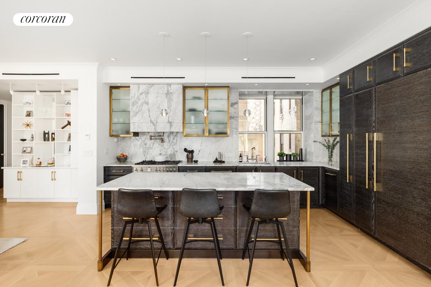 The adjacent windowed kitchen is outfitted with custom oak cabinetry, Calacatta marble slab countertops, an integrated oversized Miele refrigerator with side freezer, Miele dishwasher, Bertazzoni six-burner range, Gaggenau microwave drawer, wine cooler, and warming drawer. A large island offers ample prep space, complemented by eastern exposure.