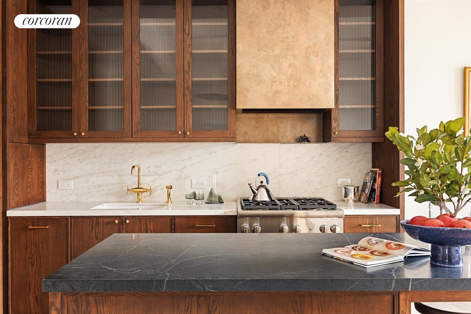 Kitchens are generously sized and are as practical as they are beautiful. Floor-to-ceiling custom walnut and reeded glass cabinetry includes generous storage and pantry space, while massive dining islands are finished with jewel-like brass footings, and countertops and backsplashes that uniquely integrate Italian soapstone and Calacatta marbles. Professional appliances include vented Thermador gas ranges with distinctive brass hoods and a paneled Bosch fridge and dishwasher package.