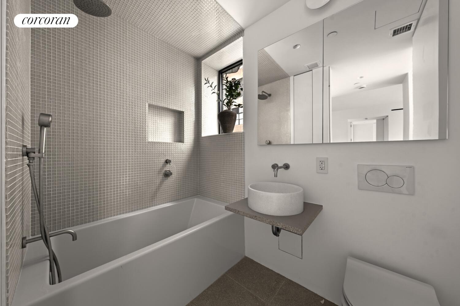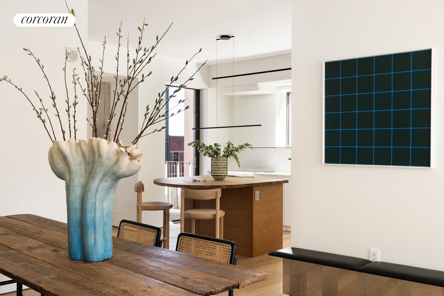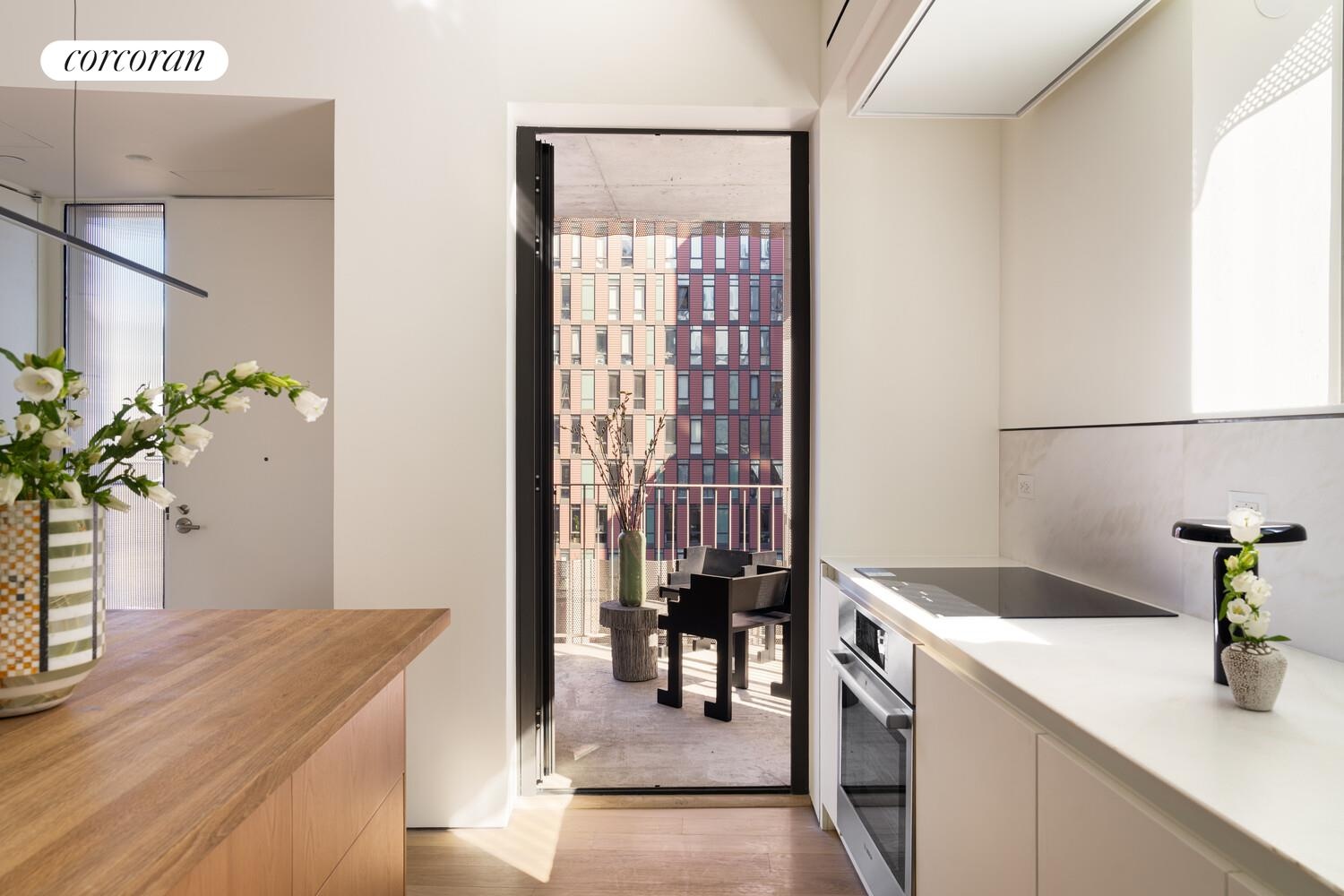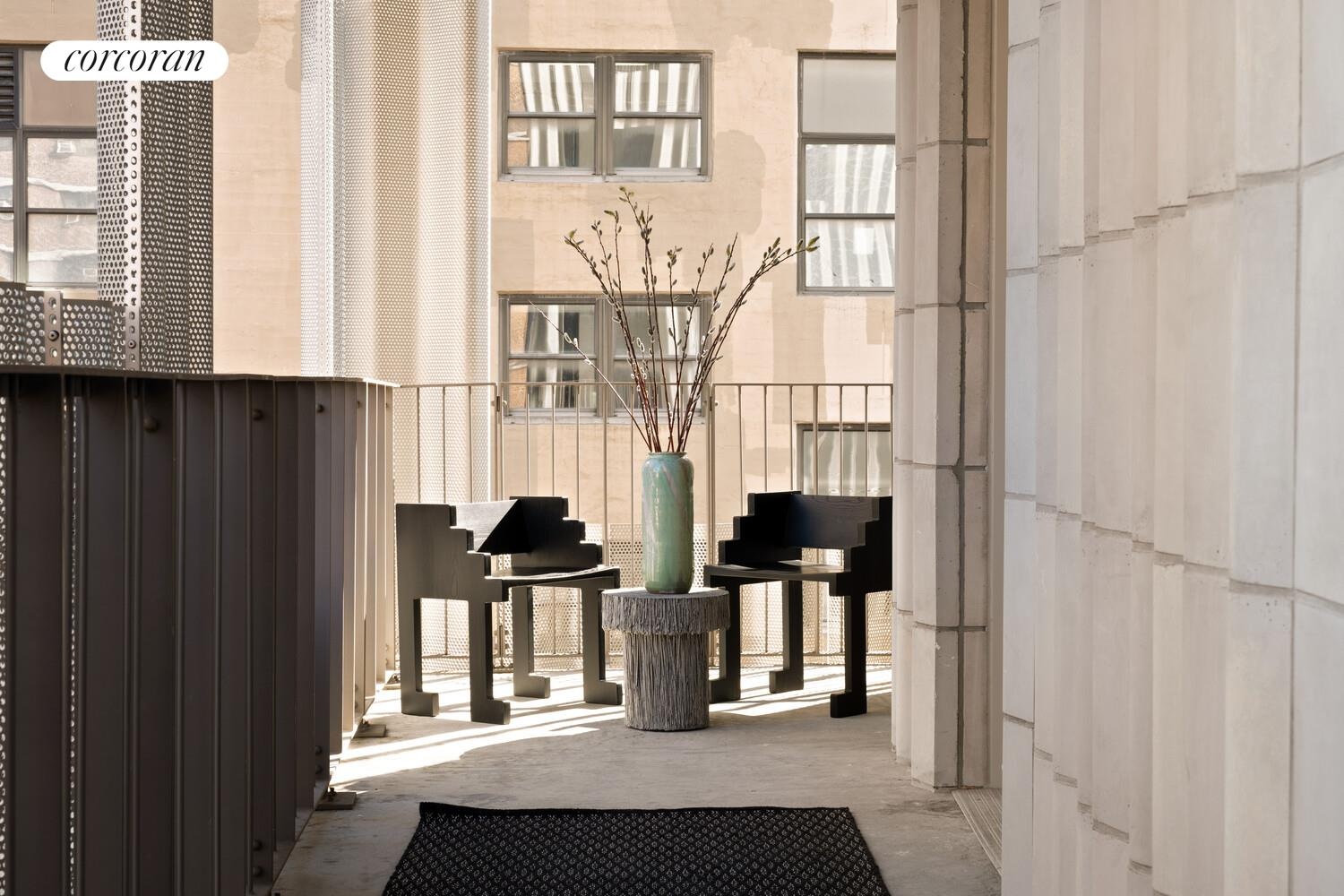 Residence 5C is a 1,164 SF, corner two bedroom, two bath home offering north, south and east exposures, a private entry landing, and covered loggia overlooking the neighboring cathedral. The loggia is framed by a beautiful, perforated screen, which allows light to filter in but provides added privacy and weather protection making it a true extension of the interior. The expansive great room allows for a large dining table, and generous living area with a wall of glass facing the loggia. The kitchen is the focal point, with its gorgeous organically shaped island functioning as an additional gathering space. The primary bedroom offers a full wall of closets, and a stunning en-suite bathroom with dual sinks and walk-in shower. The secondary bedroom has corner exposures, a built in desk and a windowed hall bath with a white glass mosaic tub/shower.