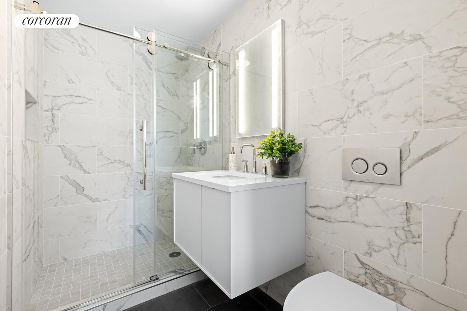 The primary suite offers brilliant light and a large closet, along with a finely detailed en-suite bath clad in Bianco Statuario and Fiorana Onyx tile. A glass-enclosed shower completes the composition. The secondary bath features a deep soaking tub. Both bathrooms are appointed with Kohler polished chrome fixtures, wall-mounted commodes, and clean-lined vanities with undermount sinks.