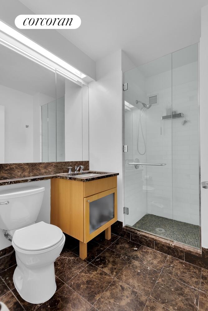 Bright and spacious bedrooms offer large closets and open city views. Two bedrooms feature en-suite bathrooms, while the third is served by an adjacent full bath, ideal for guests. The serene primary suite is quietly set apart from the rest of the apartment and includes three closets and a sublime, windowed primary bathroom with a spa shower and deep-soaking Kaldewei tub.