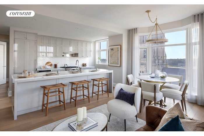 Residence 11F is a 1,577 square-foot three-bedroom, three-bathroom home situated on Claremont Hall's tranquil northwest corner. Overlooking iconic Riverside Church, Sakura Park, Riverside Park, and Grant's Tomb, this home's open concept corner living and dining room incorporates four oversized windows, including one of the property's signature 8" bay picture windows. The primary bedroom features an ensuite bath with double vanity and glass-enclosed walk-in shower, and a large walk-in-closet. Two additional bedrooms and two full baths complete this gracious residence.